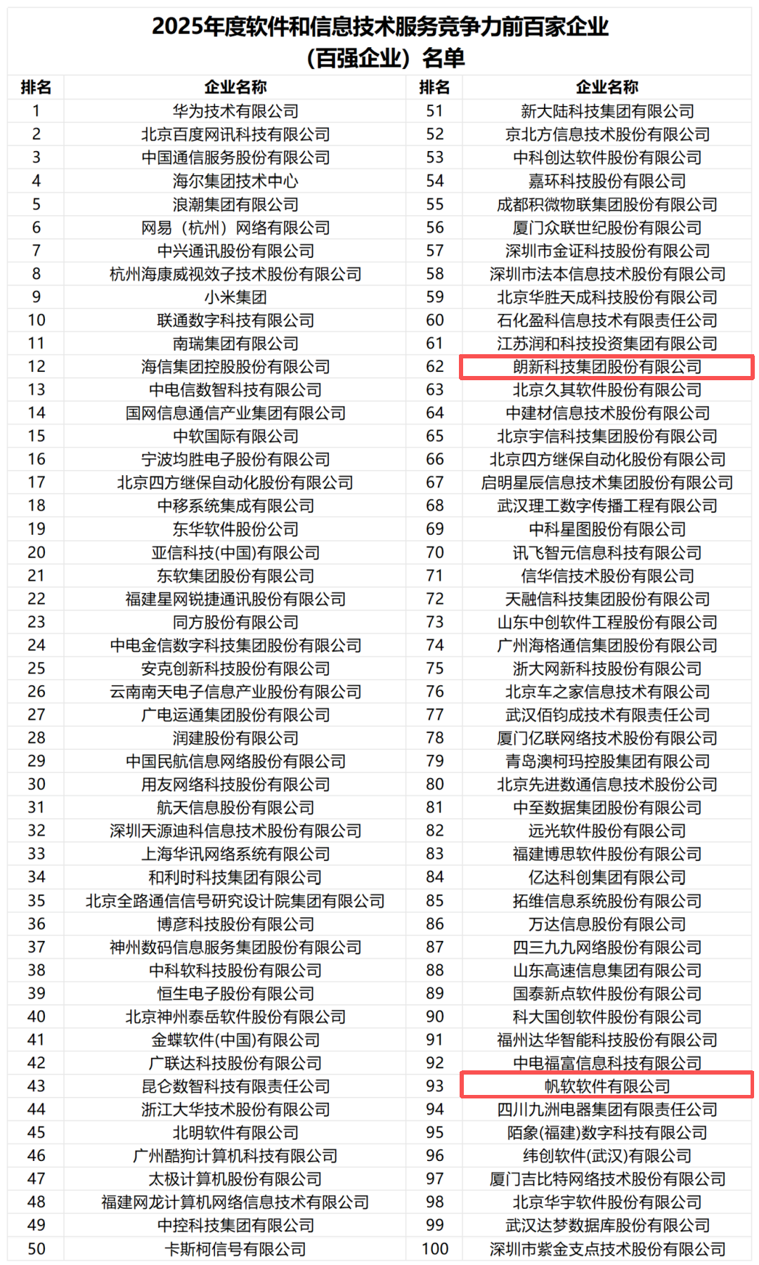 朗新科技集团凭借持续创新的技术积淀与深度赋能的行业实践再度荣登榜单,位列“2025年度软件和信息技术服务竞争力百强企业”。