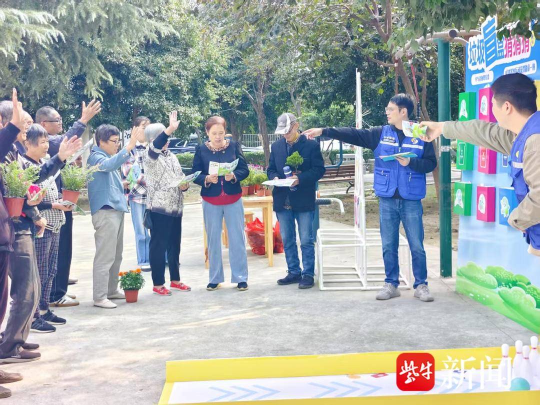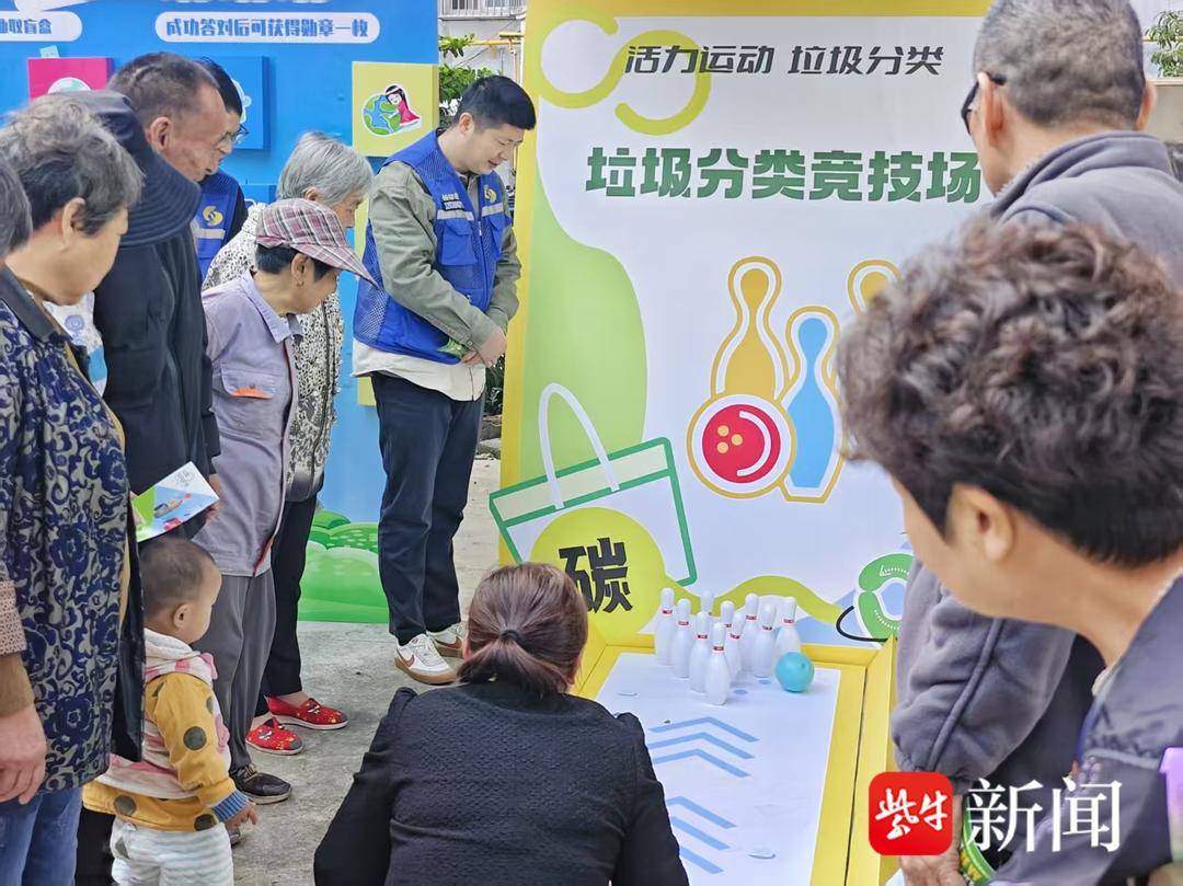 当天上午9点半,丽和苑小区广场上,布置的五彩展板格外醒目,“低碳环保”“变废为宝”等标语搭配卡通图案,营造出轻松活泼的氛围。三大互动区暗藏巧思,更蕴含深刻环保寓意:“飞向绿色未来”飞盘挑战赛中,不同颜色飞盘代表四类垃圾,居民精准投递,每一次出手皆践行分类理念;“垃圾分类竞技场”保龄球大战,印有垃圾标识的球瓶被逐一击倒,象征对环境污染的清零行动。居民感慨:“每打倒一个,就像为家园扫净一处角落!”;“你问我答”知识擂台前,居民认真答题赢取多肉、薄荷等绿植奖品——这份“看得见的绿色”,成为家中最生动的环保提醒,在日日养护中悄然养成分类习惯。
