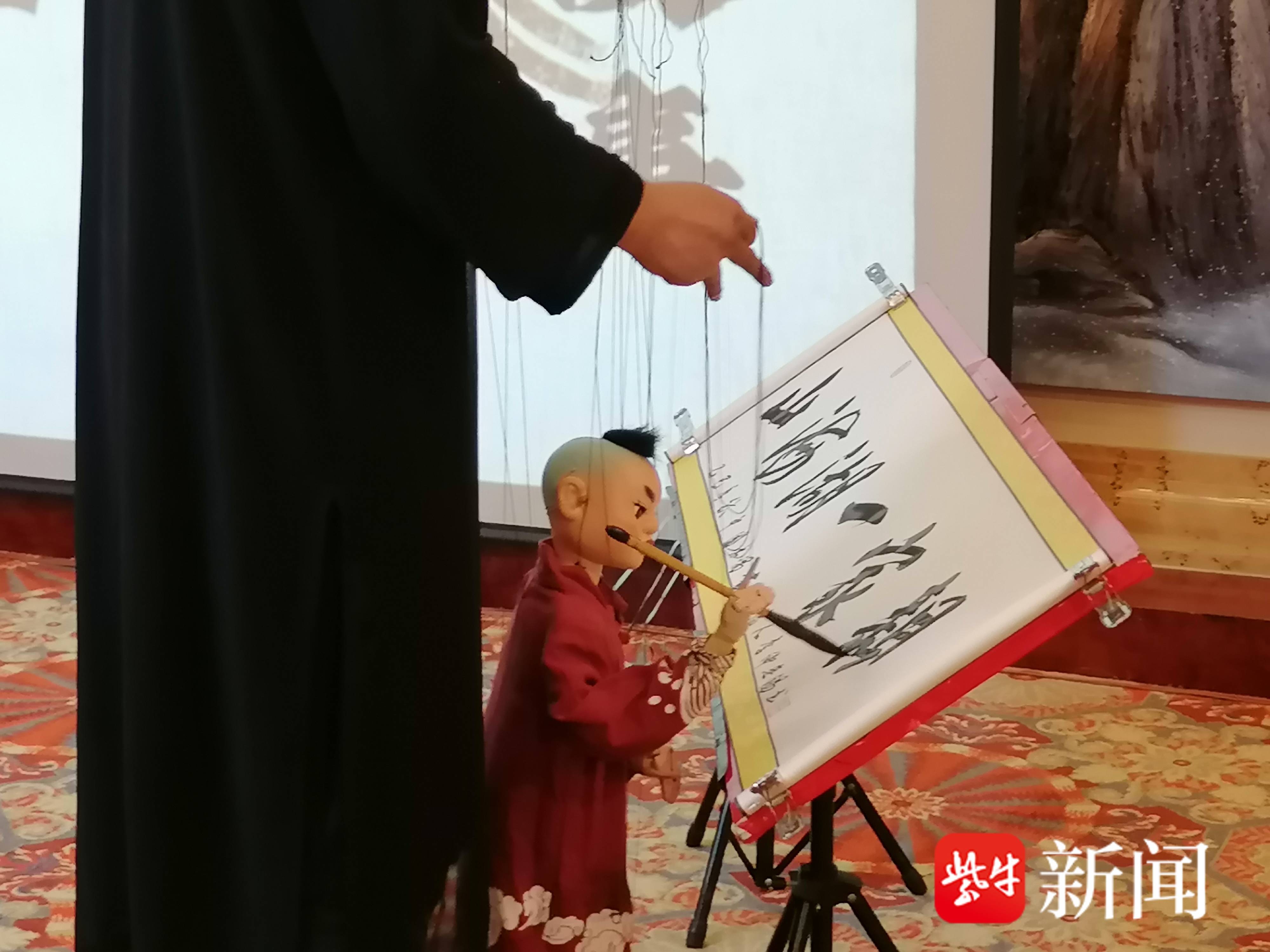 木偶戏表演,木偶“写”书法。张建波 摄