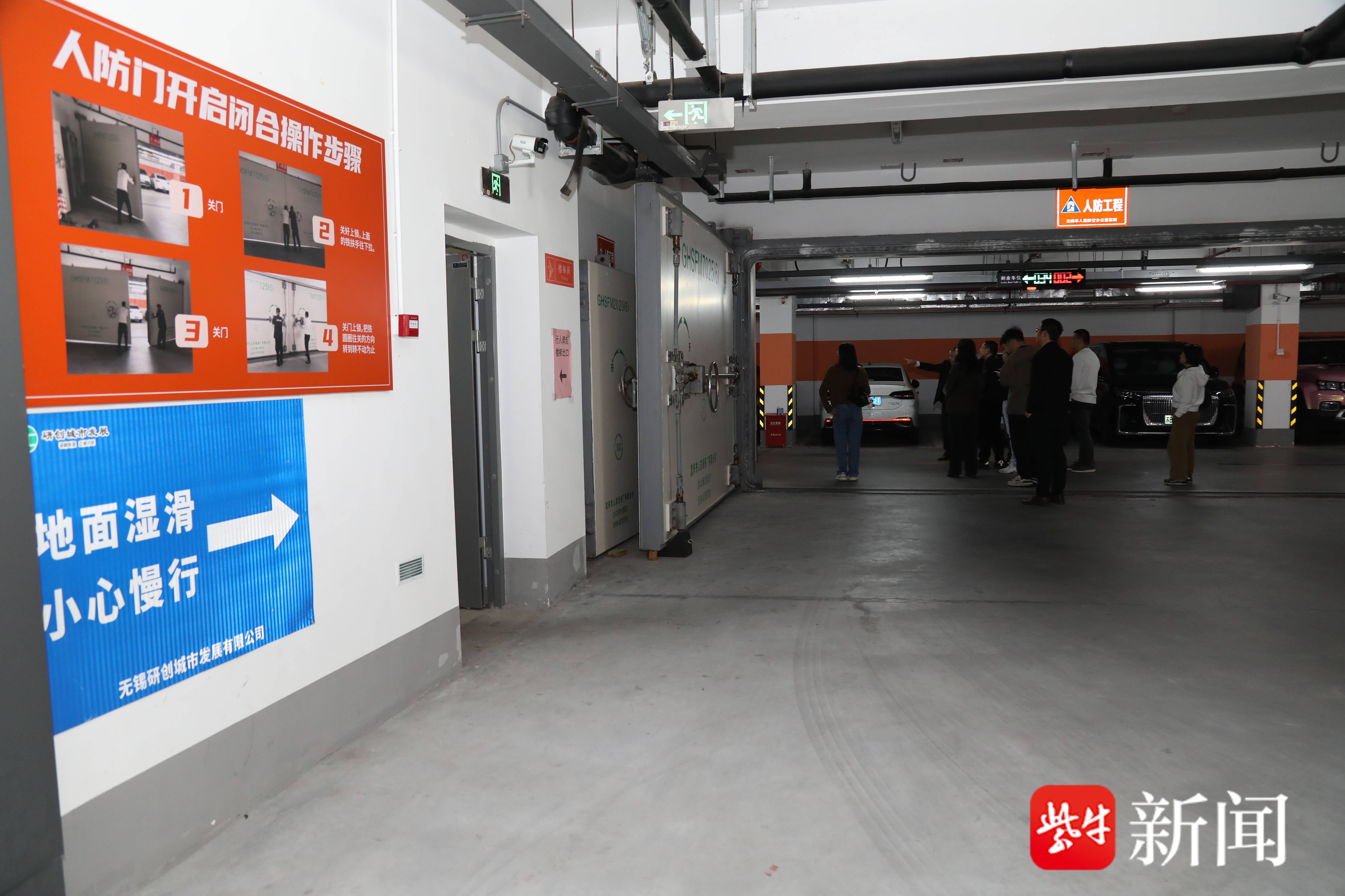 在无锡滨湖区人防工程主题创意园,人防工程巧妙实现从“单一停车”升级为“综合服务体”。管理人员演示并介绍了水动力全自动防洪闸、新型平移式防护门等创新产品。这些技术成果显著提升了人防工程的智能化水平和综合防护能力,特别是在应对城市内涝等突发公共事件方面展现出巨大应用潜力。它也是省内首个结合“人防工程”、“平时停车库”、“应急避难场所”、“平战转换示范工程”、“城市休闲兼人防主题宣传公园”的“五合一”自建人防工程。这里没有传统的密闭感,通过图文展板、互动屏幕、应急装备展示,将人防知识普及与文创市集、社区活动结合。这种“宣传+服务”的模式,让人防工程从“幕后”走到“台前”。