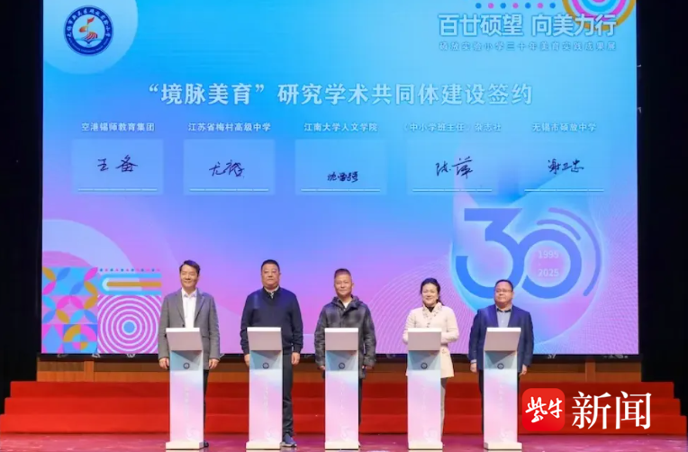集团与江南大学、《中小学班主任》杂志社等单位签订“境脉美育”研究学术共同体协议,标志着校地协同育人机制的建立。