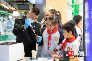 据介绍,不同于传统菜场,这座儿童友好市场让孩子们从“旁观者”变为“参与者”,三大特色体验环节让成长在实践中自然发生,也解锁了“一米视角”下的特别烟火气。在市场前台,滨湖区市场监督管理局蠡园分局工作人员化身“安全导师”,现场教育英锦园实验小学的少先队员们辨别蔬菜新鲜度、检查鱼类鲜活度。孩子们手持简易检测工具,在专业指导下学习食品安全小知识,用稚嫩肩膀扛起“舌尖安全守护者”的责任。