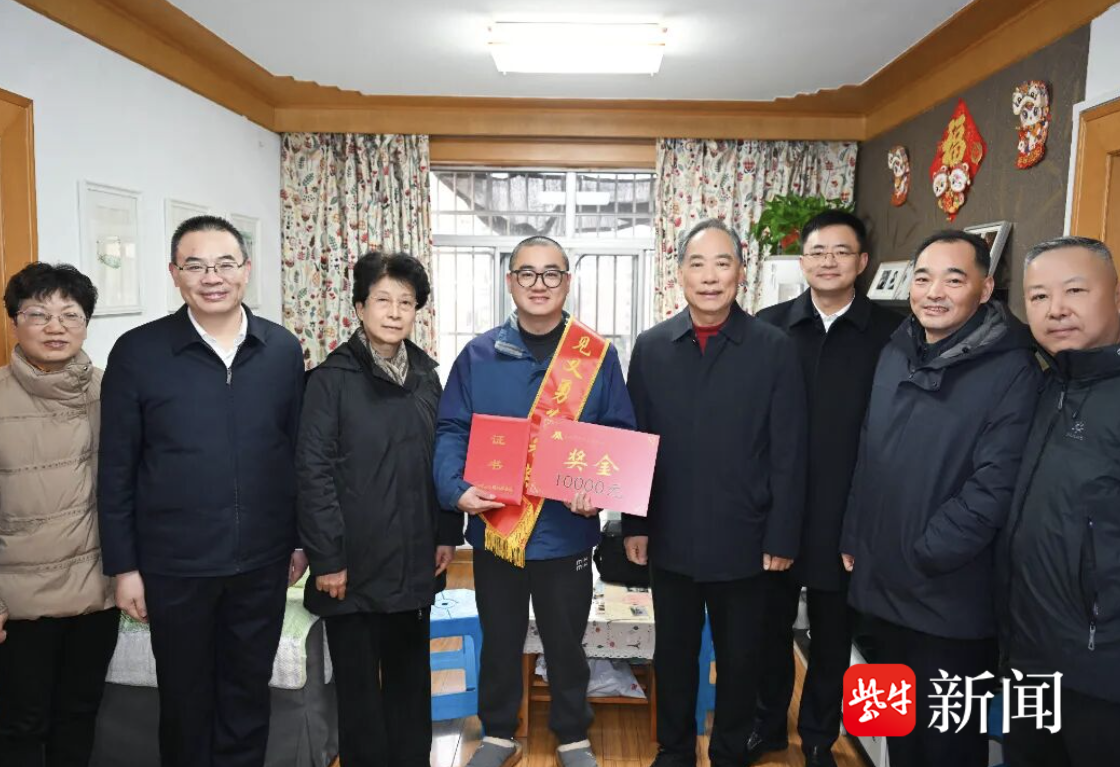 在2025年第四季度“江苏省见义勇为勇士”任维栋家中,弘强为他送上证书,对他见义勇为协助公安机关抓获持刀歹徒、保护人民群众生命财产安全的见义勇为行为给予高度赞扬,勉励他珍惜荣誉、再接再厉,影响和带动身边更多人投身见义勇为。