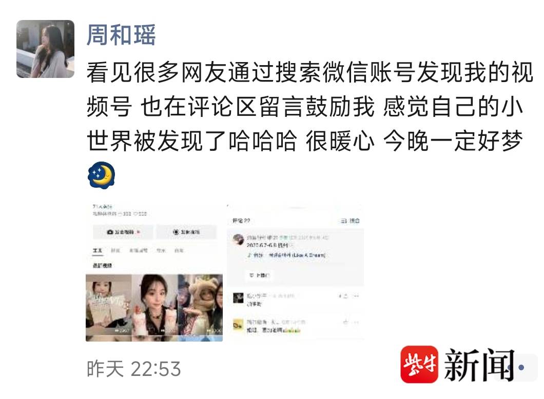 虽然面临病痛与寻亲的双重压力,周和瑶依然保持着乐观。1月24日晚,她在朋友圈写道:“看见很多网友通过搜索微信账号发现我的视频号,也在评论区留言鼓励我,感觉自己的小世界被发现了。哈哈哈,很暖心 。”她也对扬子晚报/紫牛新闻记者说:“大家特别热情,真的十分感谢!”