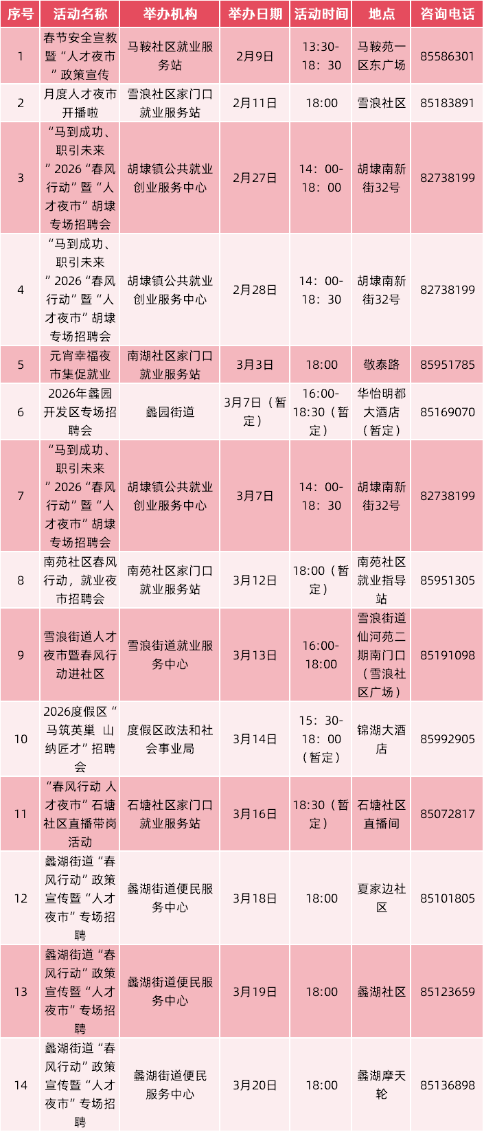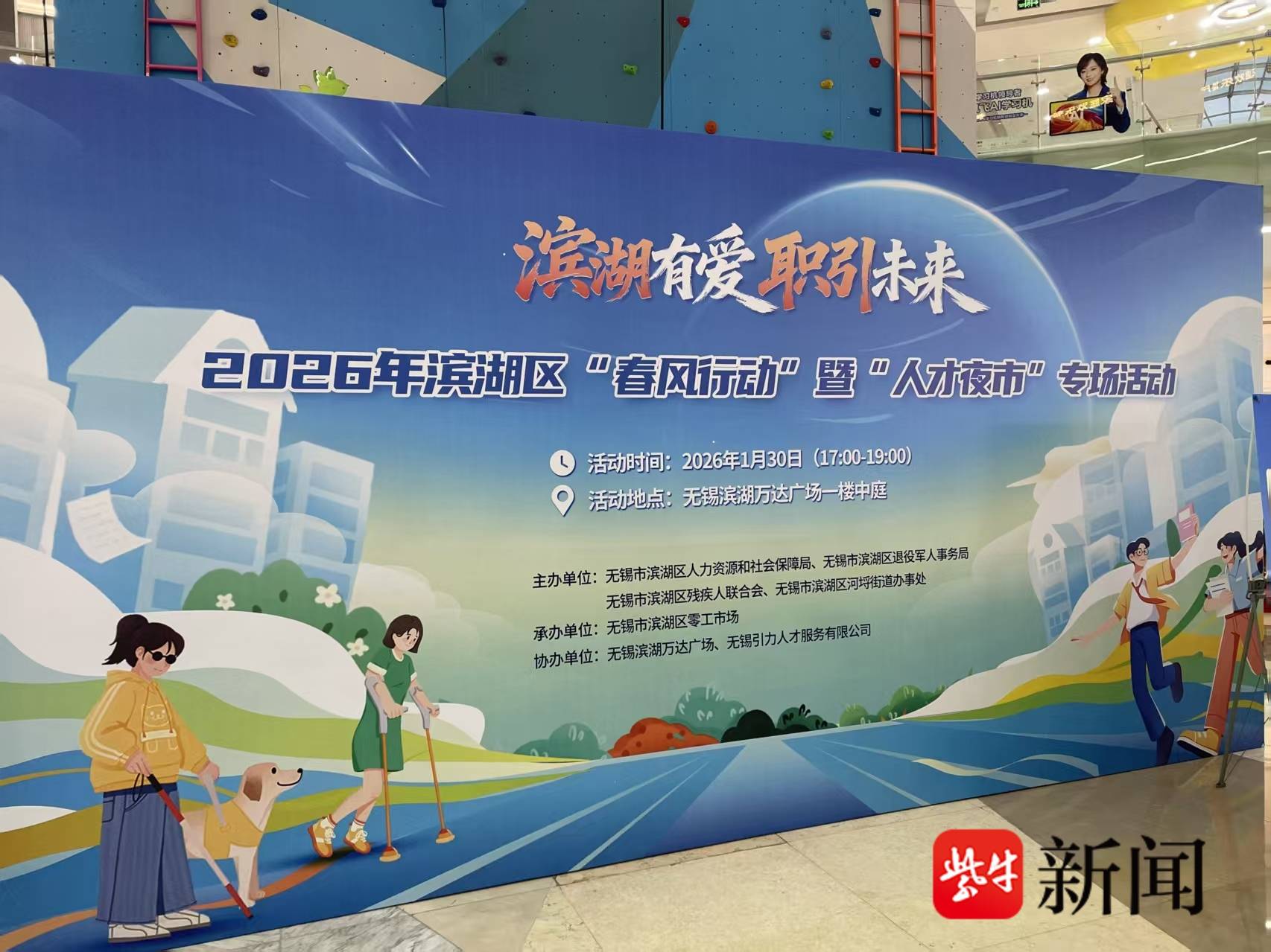 1月30日晚,无锡市滨湖区人社局联合区退役军人事务局、残疾人联合会、社保滨湖办事处、河埒街道等部门,在繁华的万达商场“就创达人社”举办了一场别开生面的“滨湖有爱 职引未来”2026年“春风行动”暨“人才夜市”专场活动。