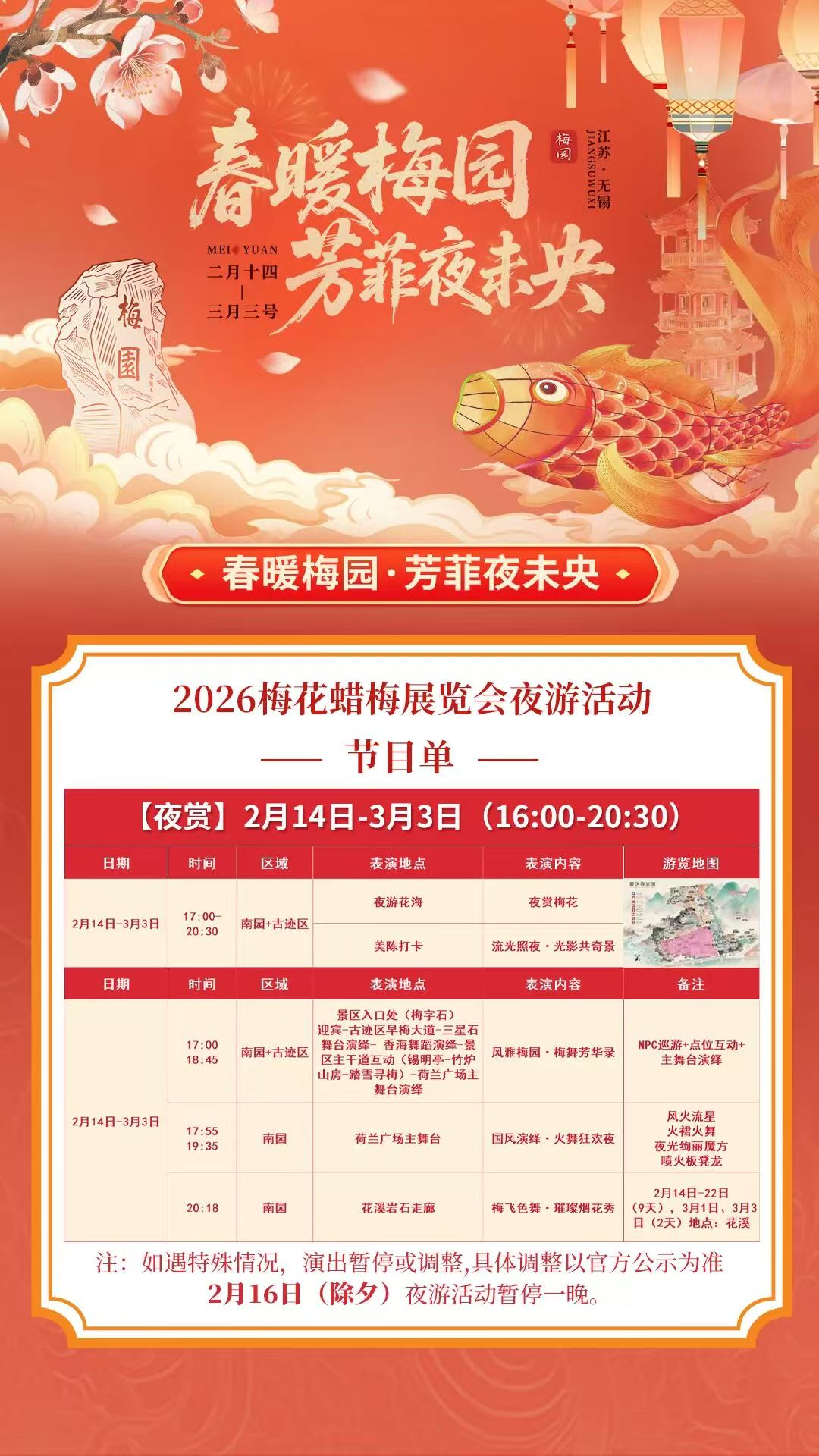 伴随着的梅花次第绽放,无锡梅园的春节系列活动开始了。记者2月14日从景区方面获悉,即日起,“福马迎春·花开福满满”2026梅花腊梅展览会春节活动正式启动,从白天到夜晚,不同的精彩持续上演,为市民游客提供休闲度假、欢庆春节的好去处。