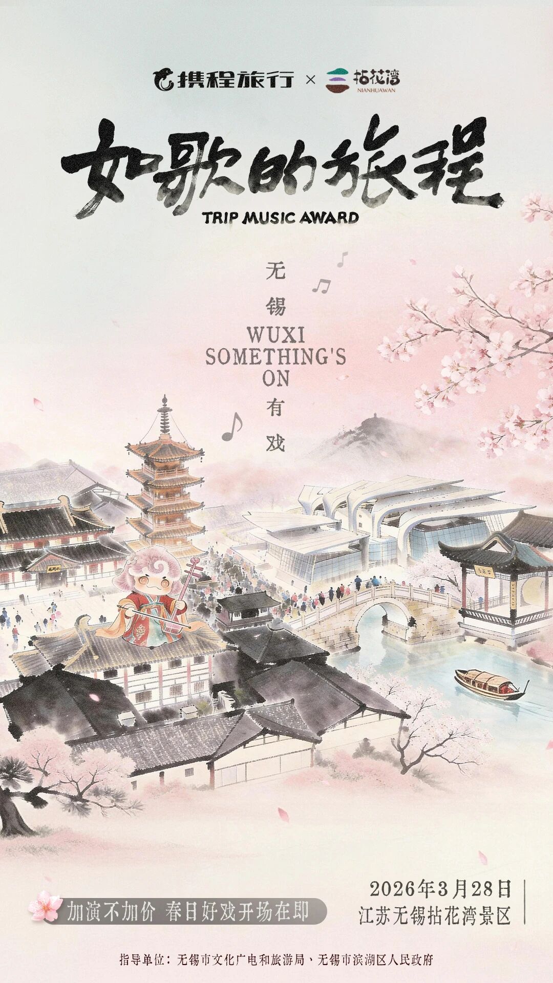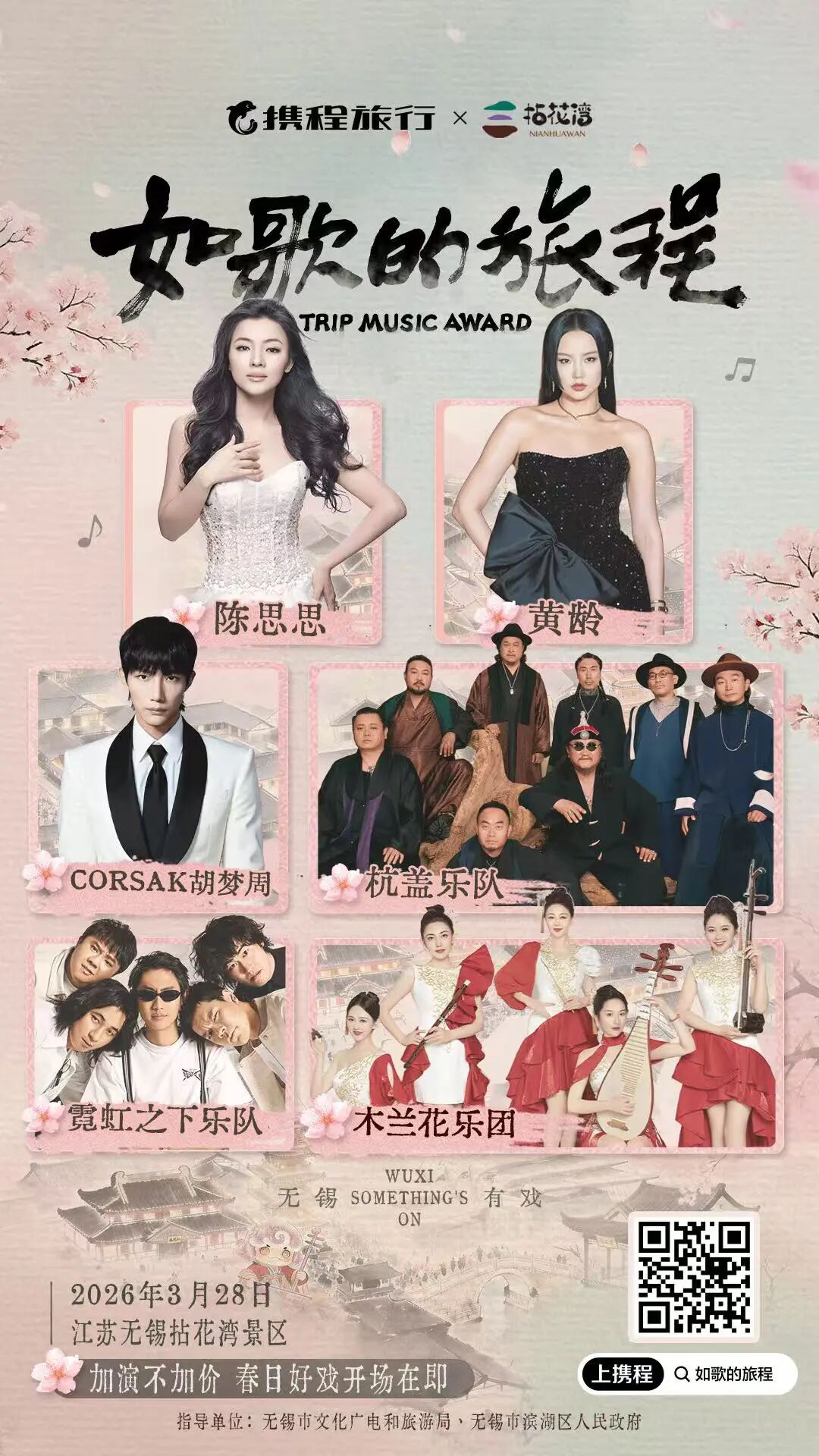 据了解,“如歌的旅程·无锡有戏”春日音乐节由无锡市文广旅局和无锡市滨湖区政府指导,携程旅行和无锡拈花湾景区主办,地点是无锡拈花湾景区的云门草坪。届时,陈思思、黄龄、胡梦周等著名音乐人,及杭盖乐队、木兰花乐团及霓虹之下乐队等知名乐团将登台,六组音乐人,六种入戏的方式,在同一片山水间,循声入戏,浪漫声动,不负心动。