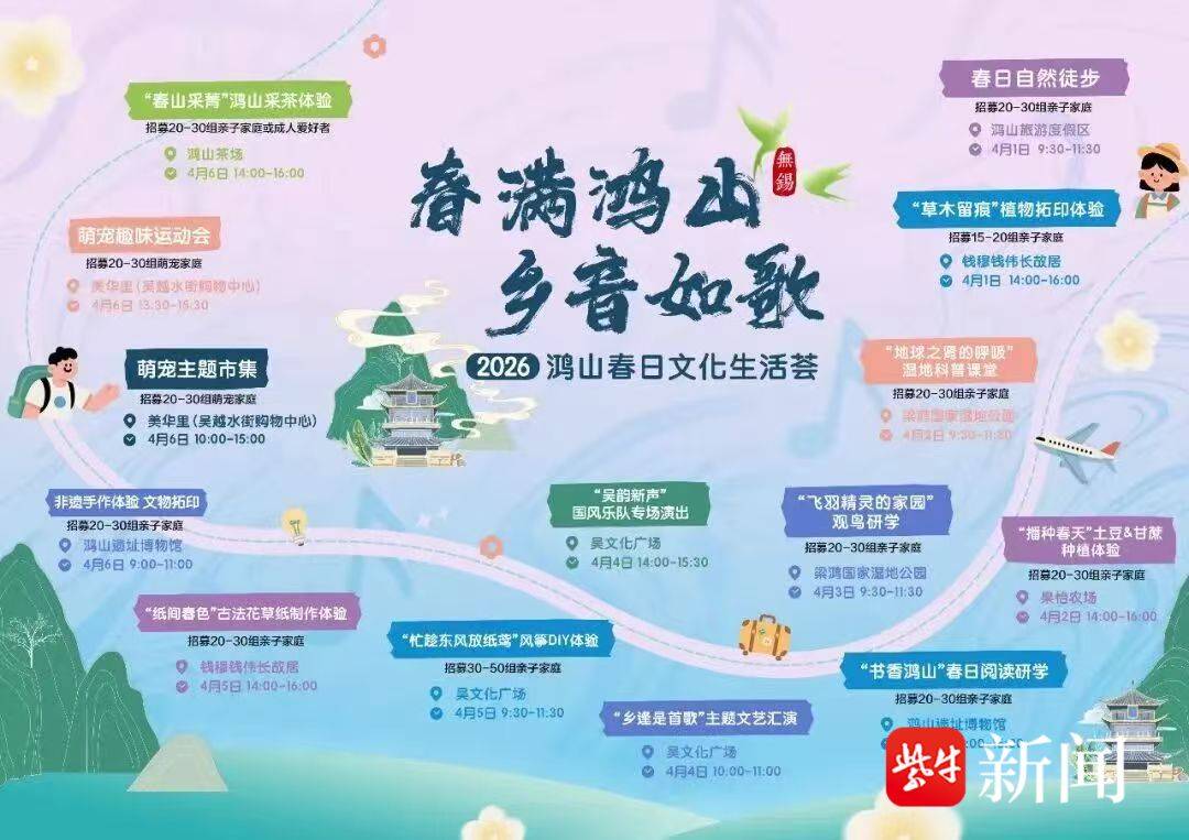 4月1日至6日,“春满鸿山·乡音如歌”春日文化生活荟在鸿山旅游度假区盛大开启。从自然徒步到湿地科普,从观鸟研学到农耕体验,从国风市集到非遗手作,6天活动日日不重样。从“官方带娃”到“景区免票”,从“工业研学”到“乡音市集”,无锡高新区以一场全域联动、全龄友好的春假文旅大礼包,回应了家长的期盼,也点亮了孩子们的春日记忆。(吴璇)