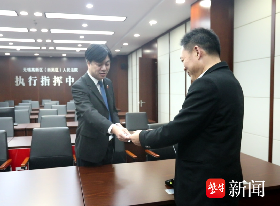 新吴法院执行法官(左)向“共享保证金”模式竞拍成功的买受人现场交付房屋钥匙