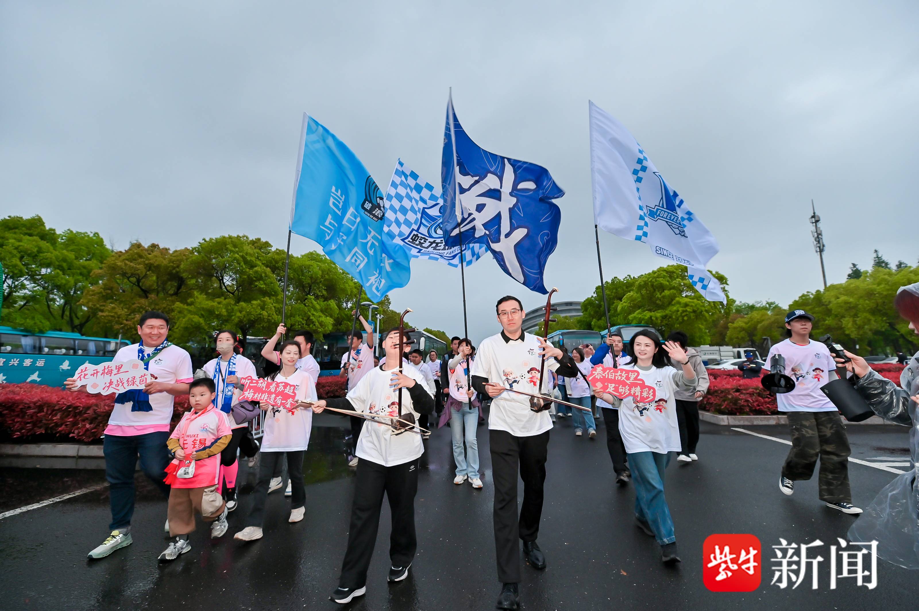 下午5时许,百余名球迷抵达宜兴体育中心门口。人群中,来自“中国二胡之乡”梅村的二胡老师纪海军与他的儿子并肩而立,父子二人各持一把二胡,弓弦齐动,一曲《赛马》在赛场外激昂奏响。父子合奏的旋律瞬间点燃了周围球迷的热情,大家纷纷驻足鼓掌、呐喊助威。