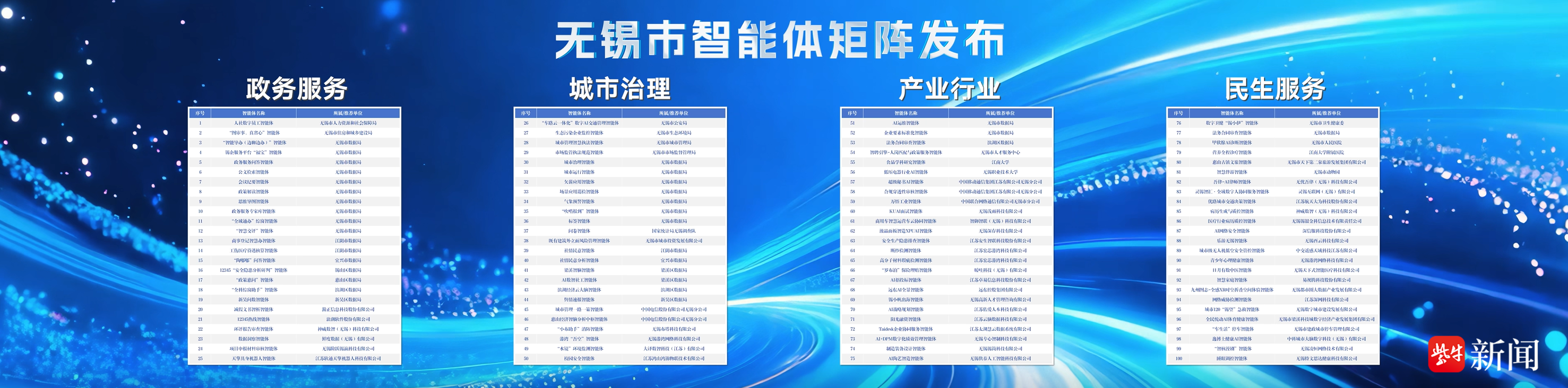 无锡此次发布的智能体矩阵包括政务服务、城市治理、产业行业、民生服务4大领域100个智能体。智能体矩阵的整体框架为“1+4+N”架构体系。其中,“1”是1个统一数字底座,为无锡全市智能体提供算力调度、模型管理、身份认证、权限管控、知识图谱、接口适配、安全审计、低代码开发等共性基础能力,是全市智能体的“中枢大脑”和“运行基座”;“4”是政务服务、城市治理、产业行业、民生服务四大领域智能体集群,是智能体矩阵的核心主体;“N”是N个细分场景智能体,针对具体业务场景打造的轻量化、专用型智能体,是矩阵的最小执行单元,可协同联动。