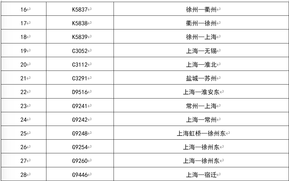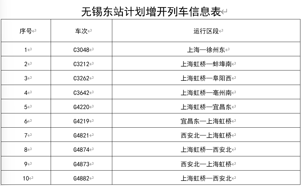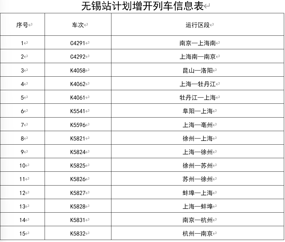 其中,铁路无锡站计划增开办客临客14对、无锡东站计划增开办客临客7.5对,江阴站计划增开办客临客1对,车次及运行区段详见图表。