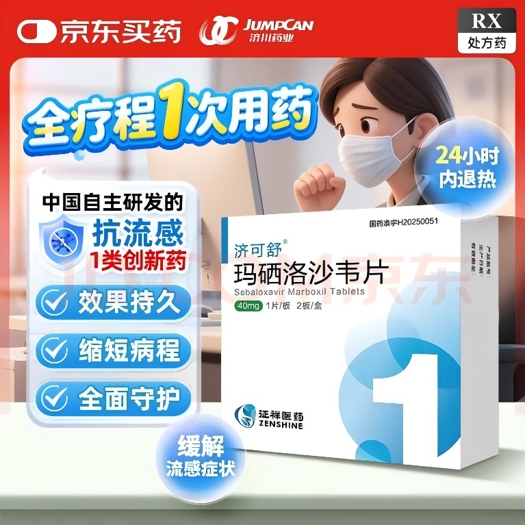 近日,全疗程仅需1次用药的抗流感1类创新药济可舒(通用名:玛硒洛沙韦片)在京东健康平台线上首发。