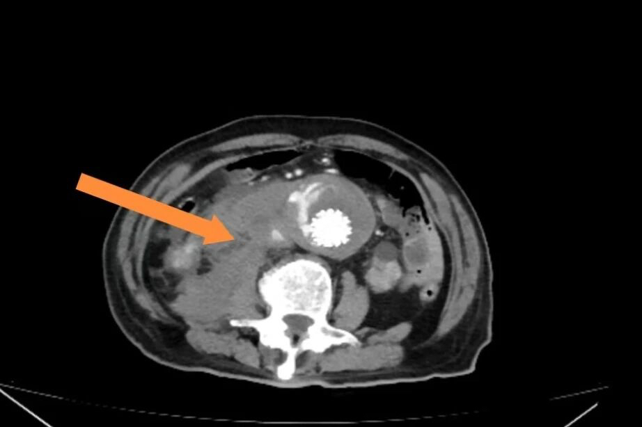 “立即做腹部 CTA!” 急诊科医生第一时间下达指令,护士已推着检查床冲向影像科。清晰的影像在屏幕上展开:多年前植入的腹主动脉支架分支出现脱落,造影剂正从支架与血管的间隙汹涌溢出,在腹膜后积成血肿。泛着白光的 “阴影”,正是腹主动脉瘤濒临破裂的信号。