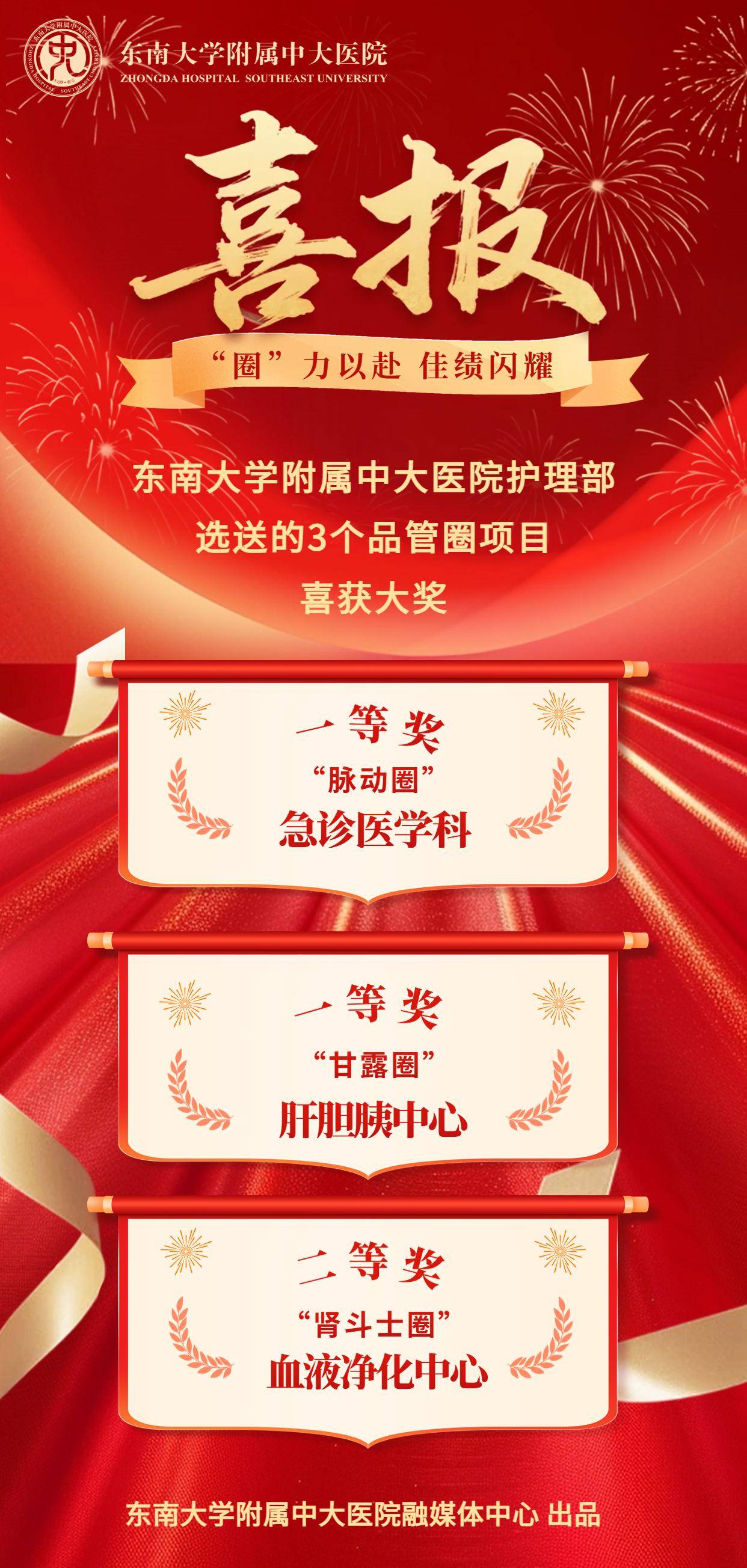 在此次大会上,东南大学附属中大医院护理部选送的3个品管圈项目从全国1680个参赛圈组中脱颖而出,经过激烈角逐,三个项目全部获奖。其中,急诊医学科“脉动圈”、肝胆胰中心“甘露圈”斩获一等奖,血液净化中心“肾斗士圈”荣获二等奖。