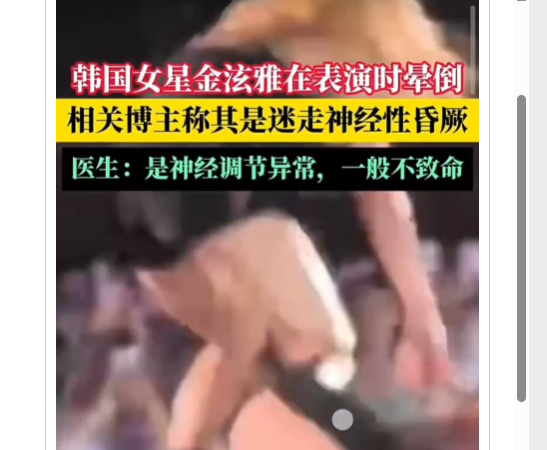 11月9日,韩国女歌手金泫雅在某音乐节上表演时,唱跳中突然晕倒,并被工作人员抱下舞台。不久后,有相关博主发布信息称,金泫雅的病是神经性昏厥。一时间,这个看似“冷门”的疾病引起了网友的热议。