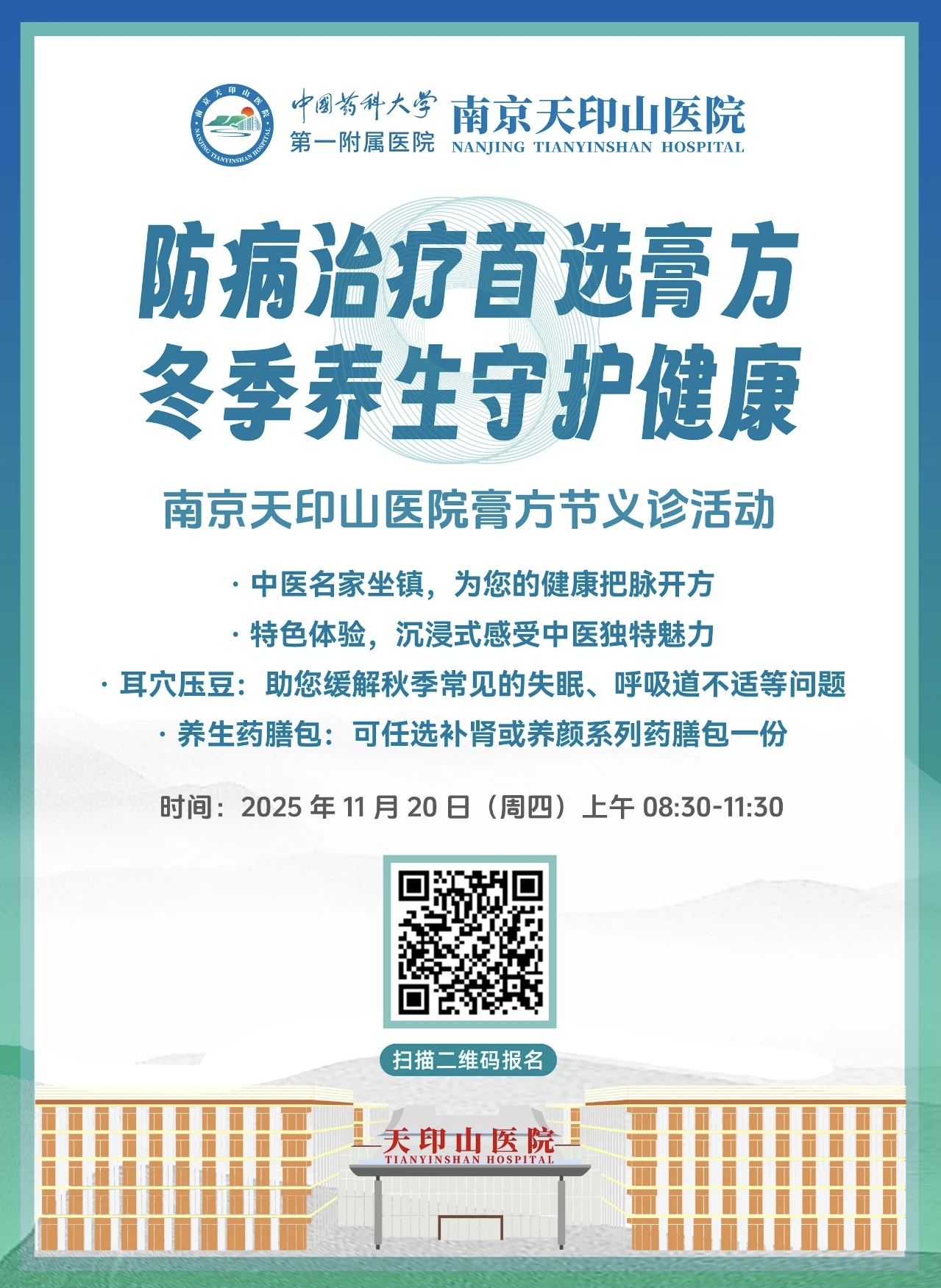 扬子晚报网11月17日讯(记者 姜婧仪 通讯员 江融宣)立冬已过,寒气渐浓,正是中医倡导“冬令进补”的黄金时节。中国药科大学附属南京天印山医院膏方节已正式启幕,11月20日,一场汇聚名医智慧的膏方节专场义诊活动,邀您一同参与!