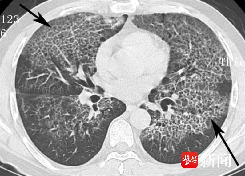 胸部CT检查结果出来后,医生发现了端倪:他的肺部布满了散在的磨玻璃影,小叶间隔明显增厚,呈现出典型的 “铺路石征”。