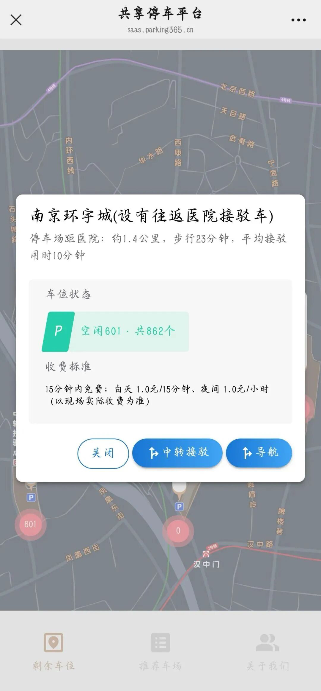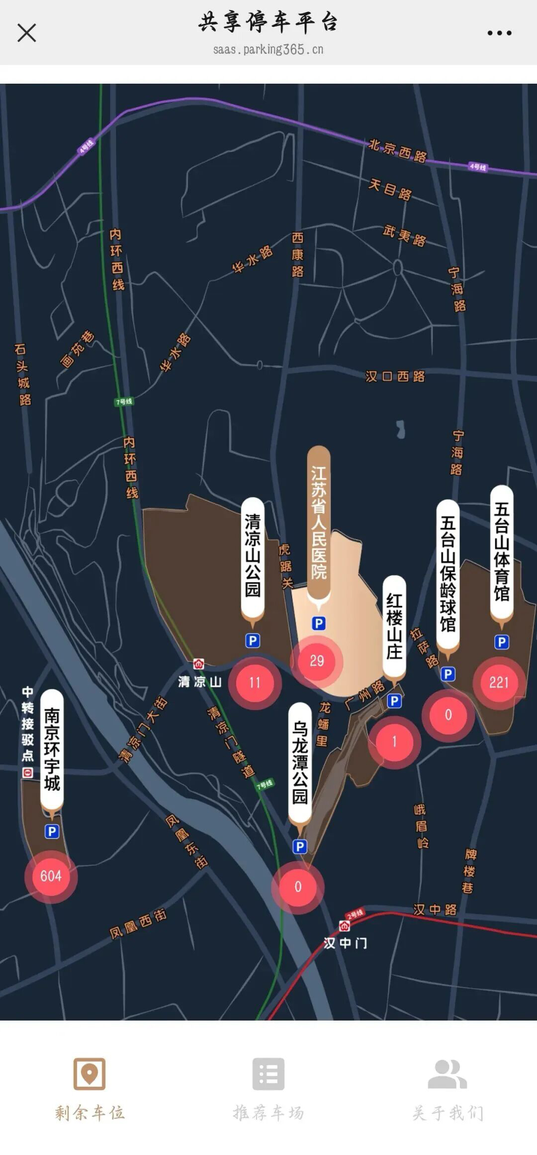 平台首批已成功接入医院附近六处停车场(五台山体育中心、五台山保龄球馆、清凉山公园、中海环宇城、红楼山庄、乌龙潭公园),可实时共享周边2km内1611个车位的动态信息。