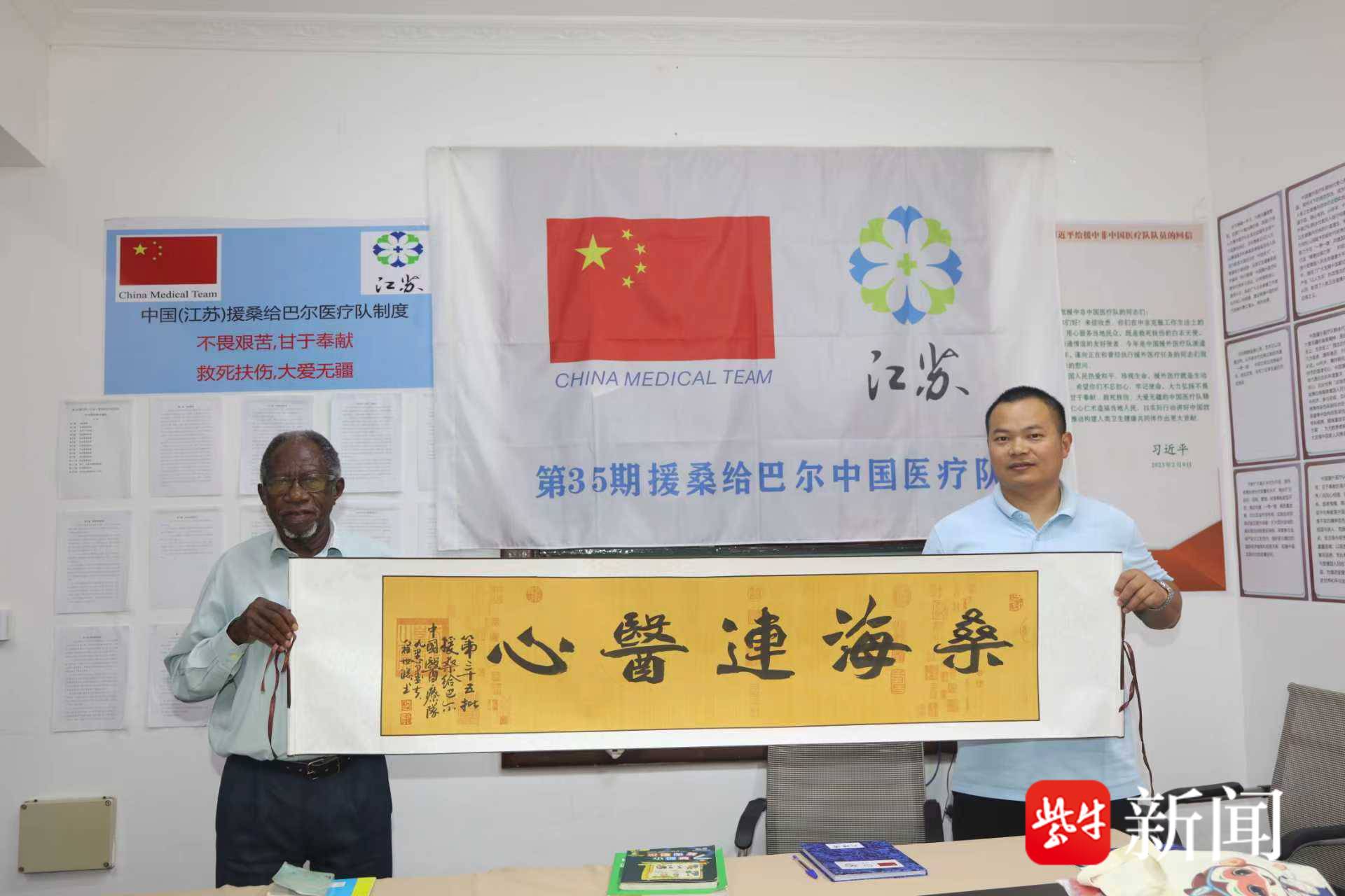 为表达对哈吉·姆维塔的敬意与美好祝愿,医疗队队长包增涛代表全体队员,向他赠送了一幅题有“桑海连医心”的书法作品。这幅作品寓意连云港与桑给巴尔虽远隔重洋,却医心相系、情谊相连,寄托着医疗队对中桑友谊长青的美好期许。此外,医疗队还赠送了由连云港市第一人民医院定制的、富含“花果山”地域特色的文创产品,以及特别定制的队服。