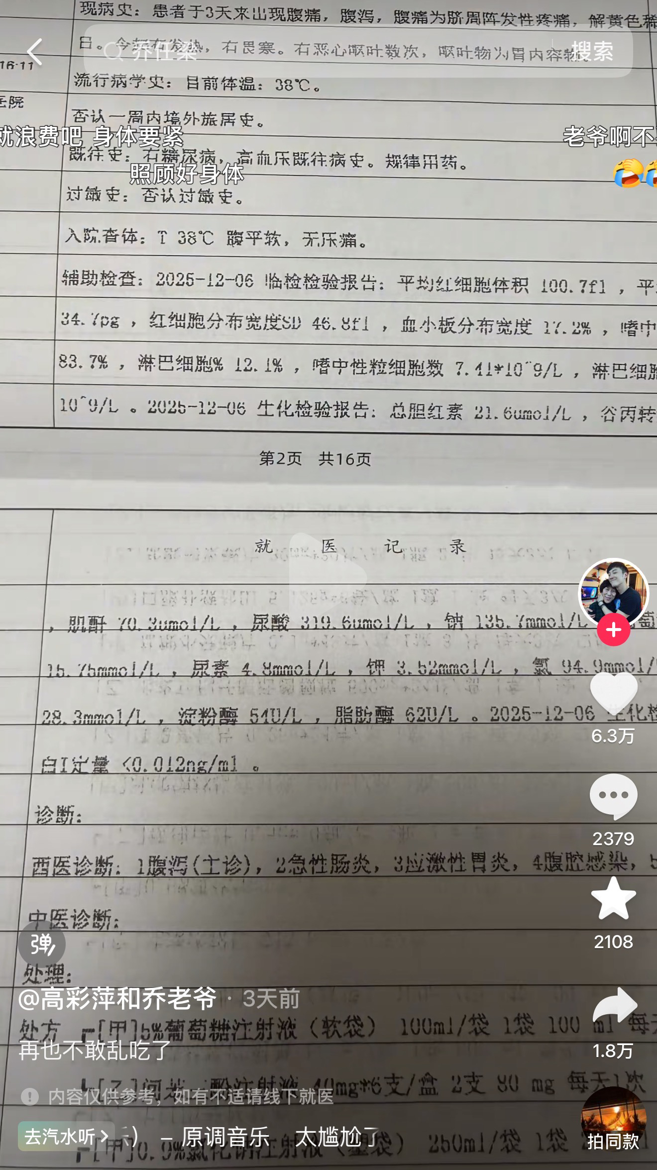“再也不敢乱吃了!”12月7日,乔任梁父亲(账号名“高彩萍和乔老爷”)发布的视频称,其因不舍得仍放了三天的大闸蟹,出现腹痛、腹泻、发热、畏寒住进了医院。就医记录显示,诊断为腹泻、急性肠炎、应急性胃炎、腹腔感染等。可就在次日,他再次发布视频,表示“本来今天已经退热也不吐了,谁知道晚上突然又高热,医生说挺严重。”视频中他还回忆,一共吃了十只螃蟹,其中八只是死蟹。