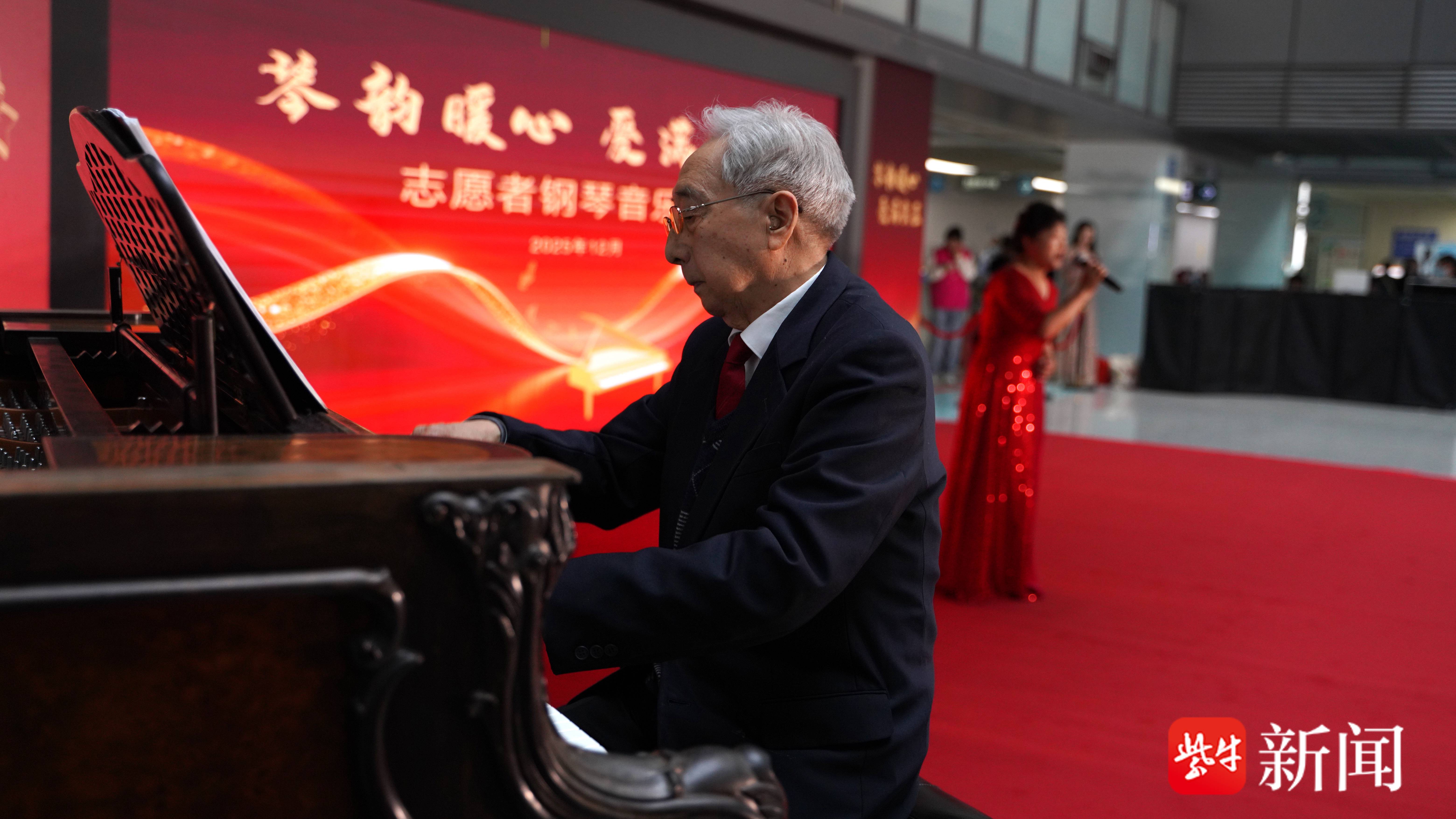 音乐会上,“一老一少”两位志愿者的身影尤为感人。92岁的南京大学历史学院离休教授沈学善自2014年起参与钢琴志愿服务,每周三上午准时来院演奏,已坚持十年。他应时选曲,春节弹《新年好》,国庆奏《今天是你的生日》,也为重症患者带去《世上只有妈妈好》的慰藉,屡获患者赞誉。此次他为女声独唱《珊瑚颂》伴奏,演出后掌声久久不息。