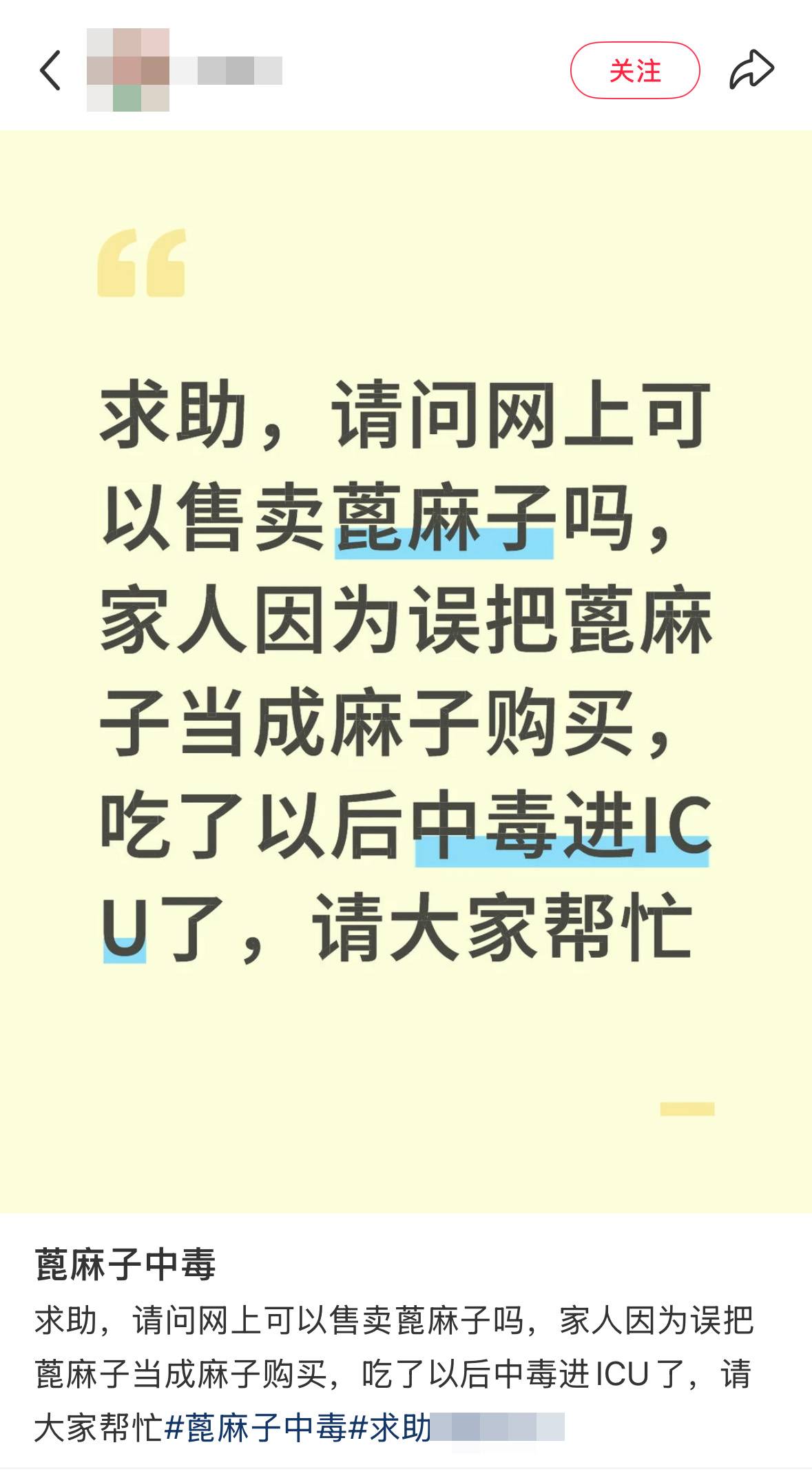 “求助,请问网上可以售卖蓖麻子吗?家人因为误把蓖麻子当成麻子购买,吃了以后中毒进ICU了,请大家帮忙。”近日,云南一名网友在社交平台发文求助引发关注。评论区里,不少网友分享类似经历,有人称自家亲人也因误食蓖麻子住进重症监护室,还有人留言称“蓖麻子外皮有毒、果仁无害”,认为中毒的根源是外皮携带的毒素;也有人回复称当前法规并没有禁止蓖麻子在网上销售。