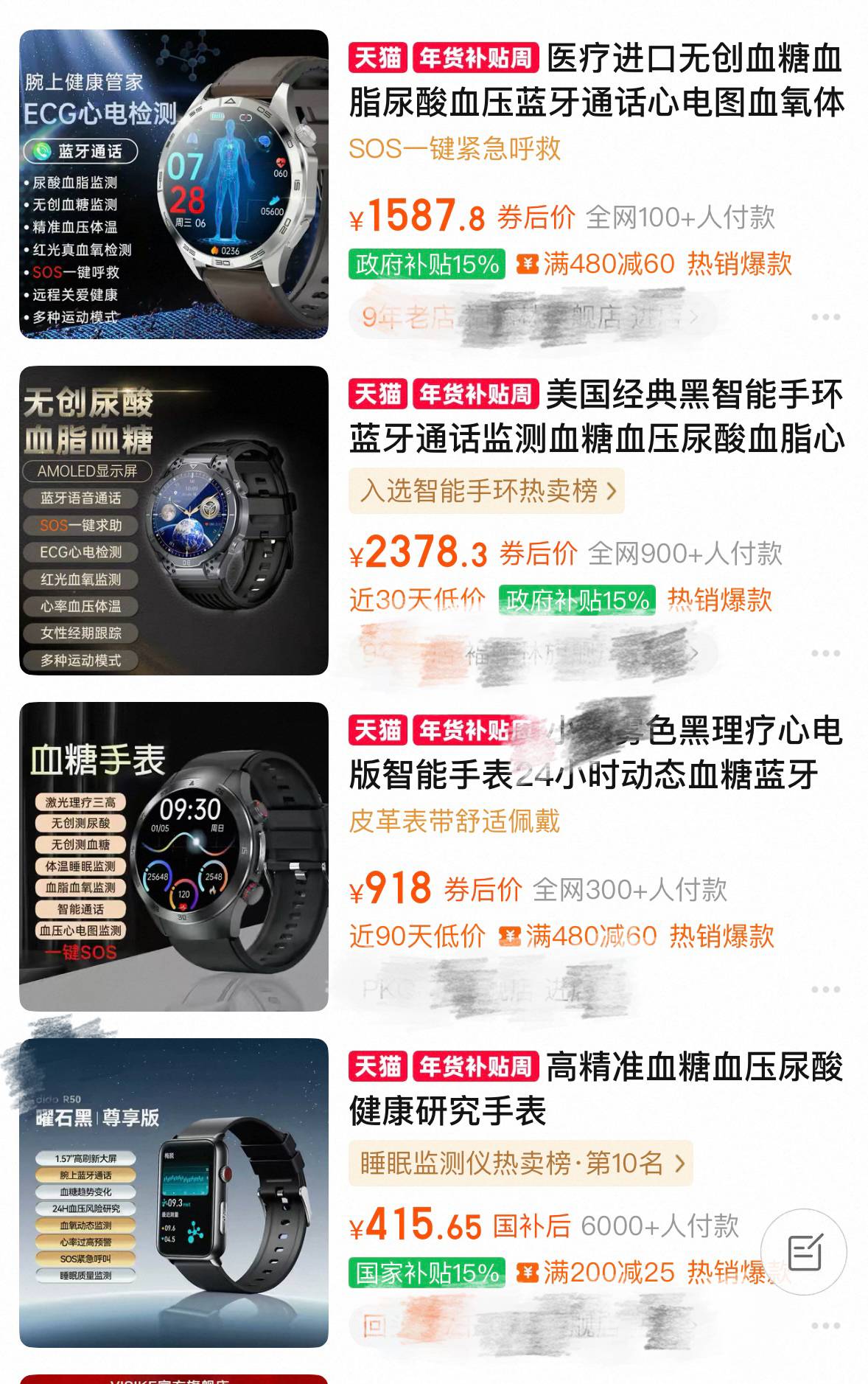 电商平台上各类测血糖手表