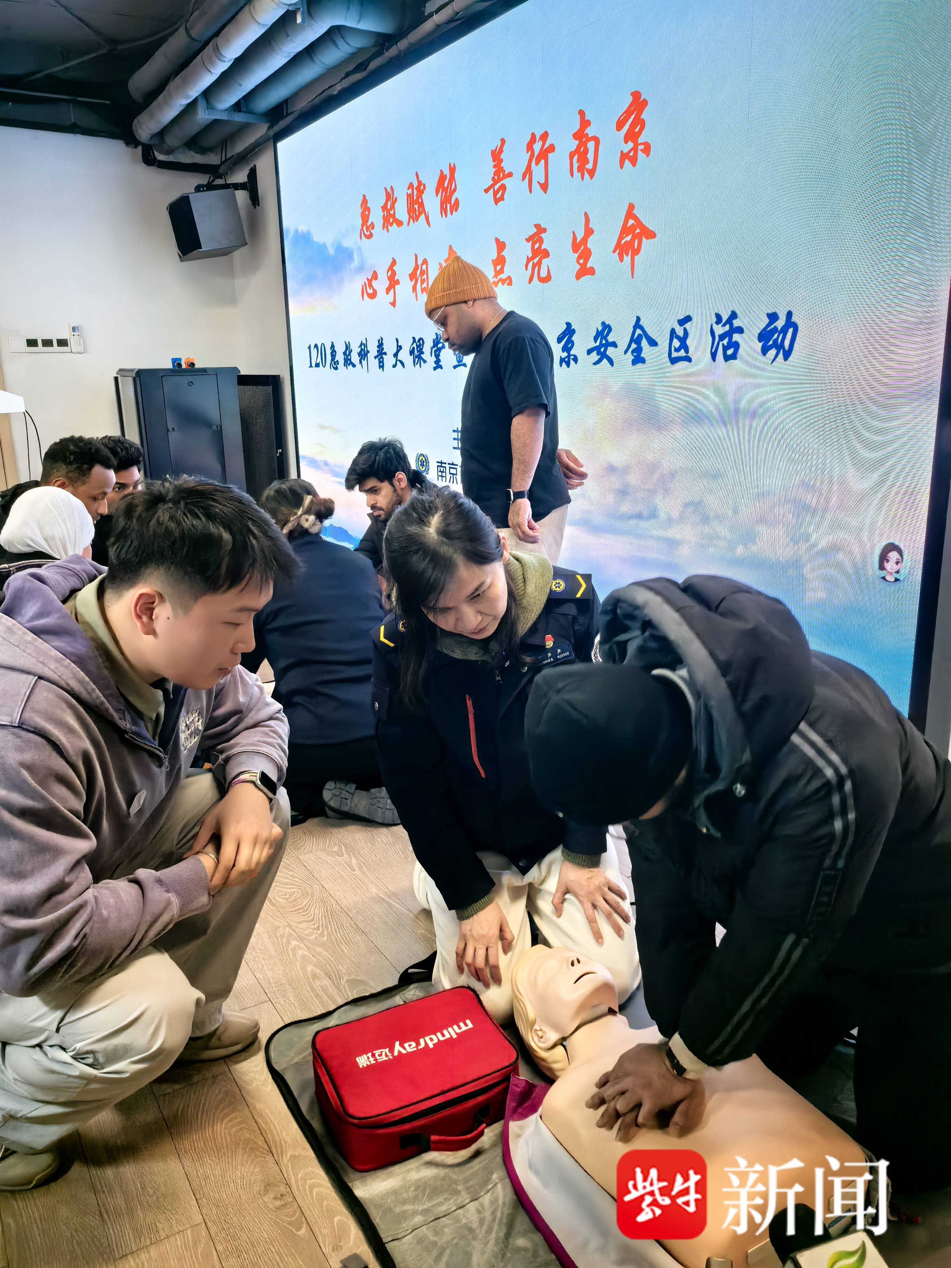 1月19日下午,南京红十字文化传播中心内,31名外籍留学生专注参与急救培训。该活动由南京市急救中心、南京市红十字会与南京信息工程大学联合打造,急救人员以中英双语拆解急救技巧,详解120拨打要点,示范心肺复苏、外伤止血、CO中毒急救等实用技能,并俯身指导、逐点纠正。留学生两人一组轮番实操,印度尼西亚学生张义诤用手机录制要点,计划分享给祖国亲友。培训后,中外参与者寻访南京安全区旧址,聆听88年前国际友人与中方志愿者携手护生的故事,让急救科普与跨国人道主义温情深度交融。