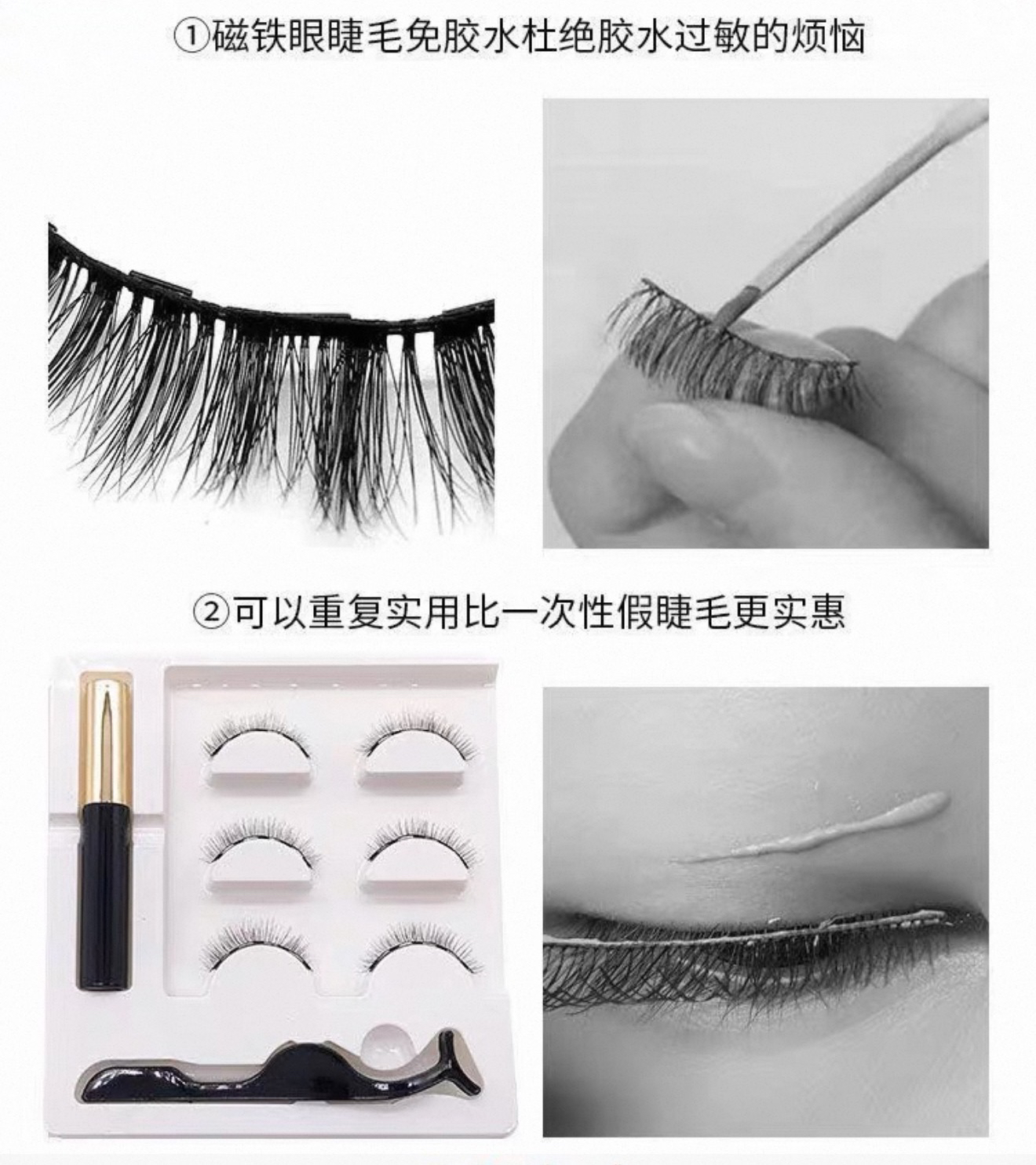 记者注意到,另一类近几年颇受关注的睫毛“美丽神器”就是磁吸睫毛。那么,不用胶水的磁吸睫毛就万无一失了吗?记者了解发现,近年来流行的磁吸睫毛主要分为两类:一类是在假睫毛梗部嵌入磁条,通过工具使上下两片吸附在真睫毛上;另一类则是先在眼睑涂抹含磁性成分的眼线液,再借助磁力将带磁条的假睫毛固定在睑缘。“磁吸眼线液同样可能殷其化学成分造成过敏或其他损伤。”