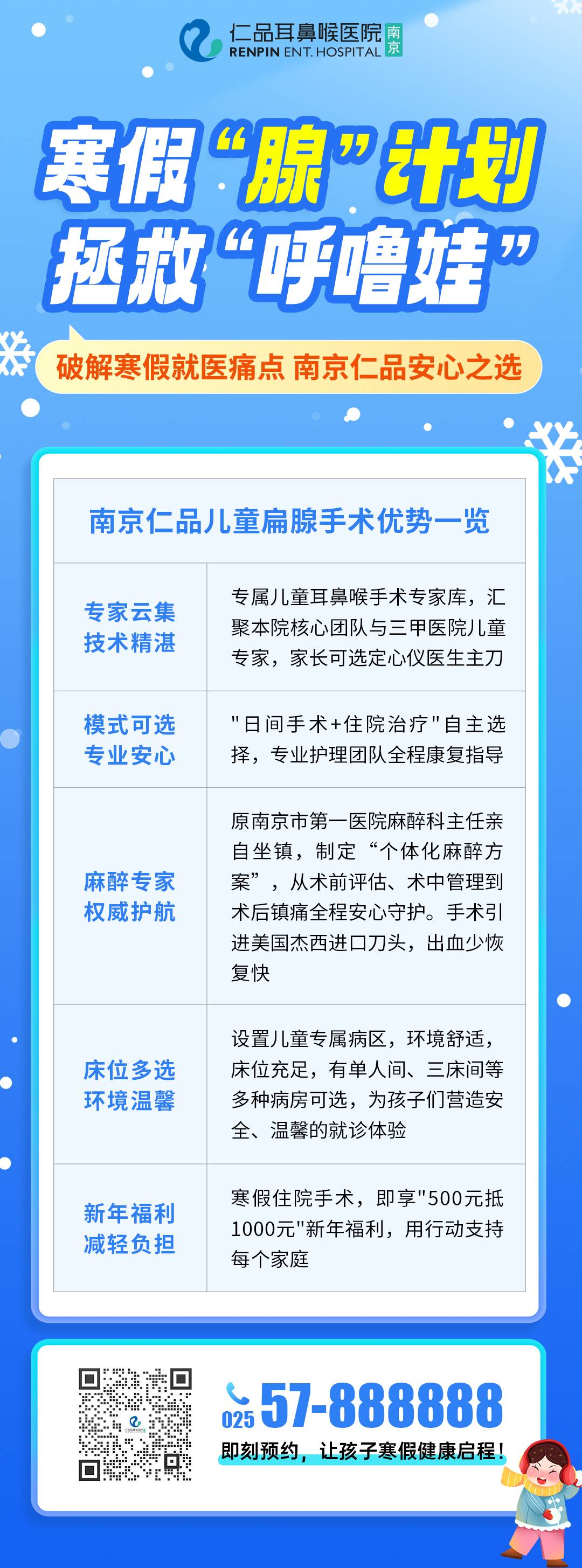 扁腺手术虽为微创手术,但术后仍需1-2周的恢复期,长达数周的寒假正是进行手术的好时机。由于寒假期间就诊患儿集中,南京仁品特别开设了“寒假儿童扁腺手术绿色通道”,建议有需要的家长可提前通过官方电话025—57888888或添加“南京仁品耳鼻喉专科医院”微信公众号预约就诊、安排手术,让孩子健康迎接新学期。