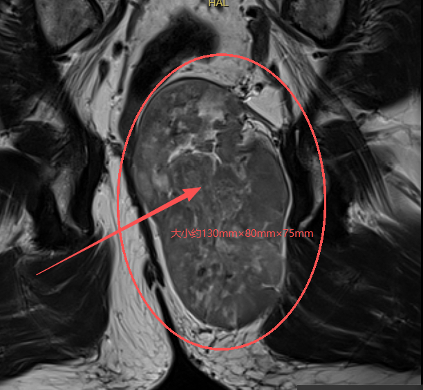 在南京市中医院,核磁检查显示:李先生直肠后方尾骨前方见不均质肿块影,大小约130mm×80mm×75mm(上下径×前后径×左右径),直肠及前列腺均受压移位。