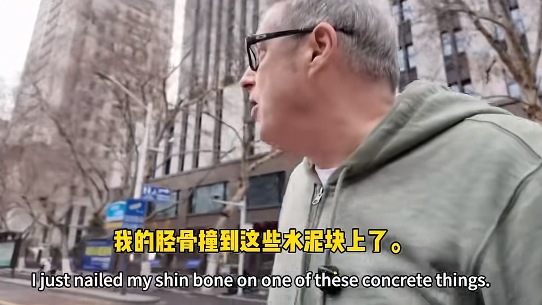 在“美国老爹”发布的视频中记者注意到,他和家人在春节期间来到乘飞机来南京游玩。2月16日除夕当天,他游览历史古迹时,意外在大钟亭附近不小心把小腿撞到了路边的水泥墩,导致其腿部受伤。因为天气寒冷加上伤口较深、肿胀、伤处不适,“美国老爹”选择至就近的南京鼓楼医院就诊。