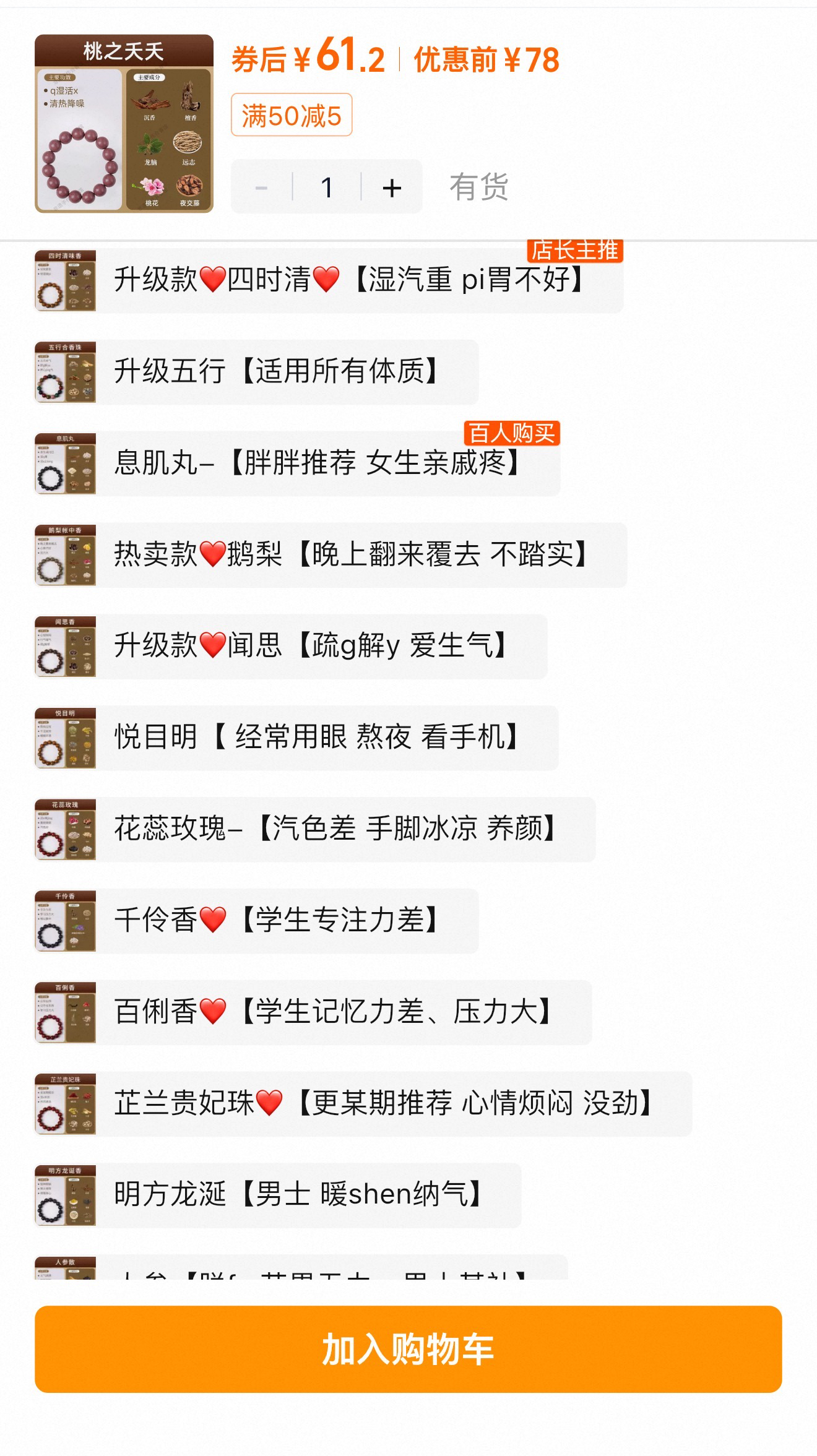 “湿气重、脾胃差,以药治香,以香养人……”记者在电商平台输入关键词后琳琅满目的相关产品跃然眼前。点进某款售价61元的中药手串商品详情页,记者发现其具体款式多达二十多种,根据成分的不同,对应的功效也有差异。比如一款名为“悦目明”的手串称含有金银花、柑橘、密蒙花、黄柏、黄连、川芎成分,适合熬夜过度、干涩疲惫、模糊不清的人群;名为“花蕊玫瑰”的手串,则标注主要成分为:玫瑰、鸡血藤、白芍、当归、熟地黄、茯苓,功效用谐音字写着“活血调经、美丽焕颜、气色好”。
