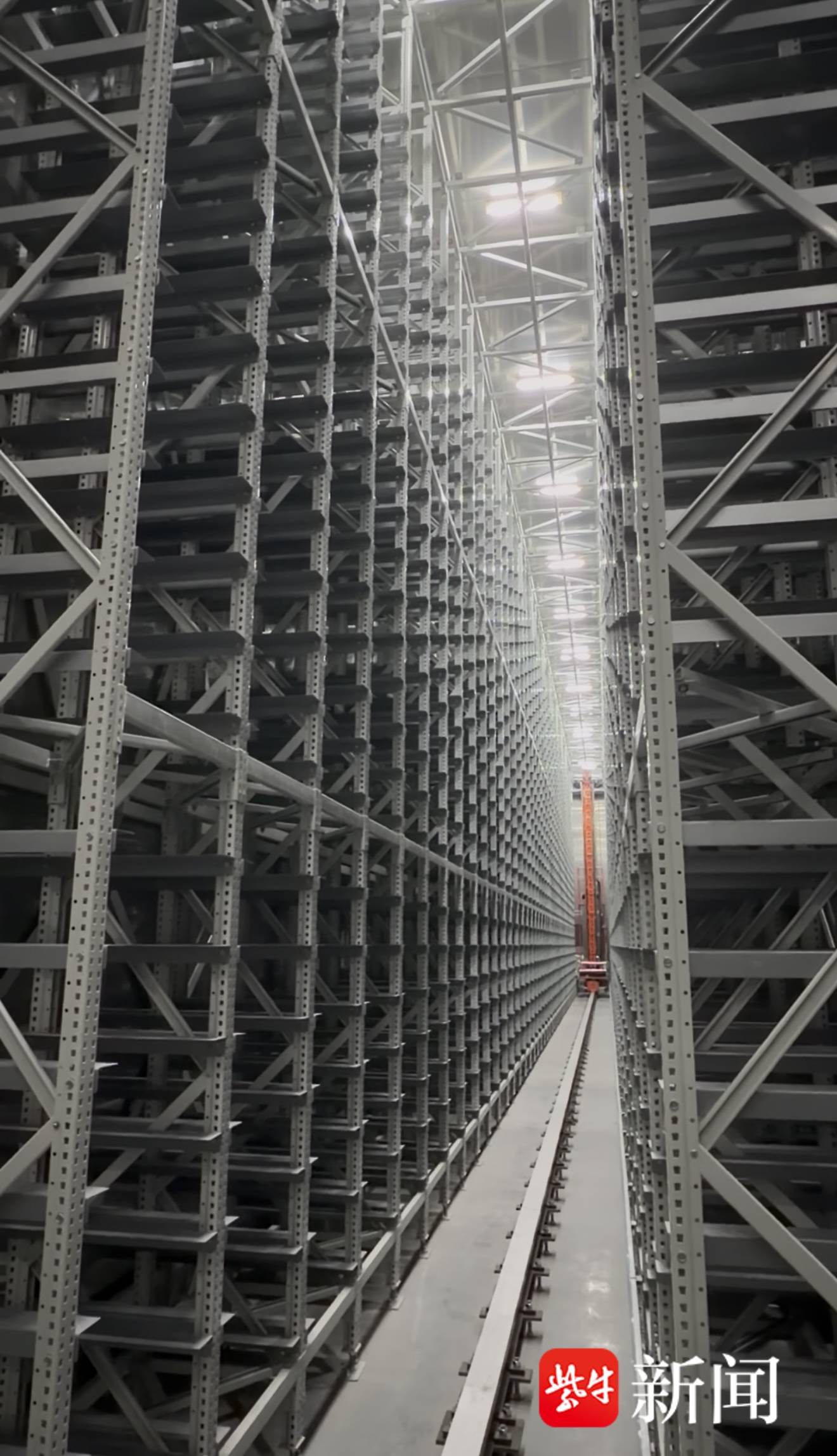 在中、长期库区,记者完全抬头才能看到两侧高大的货架,货架之间的地面上,贯穿了一条长长的供机械运行的轨道,尽头是一个橙色的堆垛机。这个自动化存储设备包括自动化立体库货架与存储单元、自动堆垛机系统、搬运机器人、挑拣机器人、智能双道门及联动控制、库内一体化视觉系统、库外操作终端等。