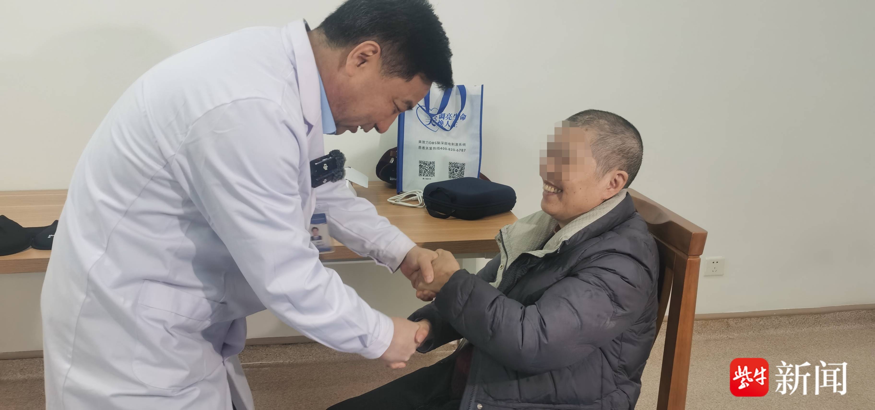 “抬抬腿,伸伸胳膊,非常好,很稳定,站起来再绕圈走几步。”邵君飞对金奶奶提出要求后,她果断站起来,大步流星地走了起来。而手术前,金奶奶她坐在凳子上,腿不停得在抖动,无法控制。金奶奶与帕金森病的斗争已持续超过7年。起初,药物尚能控制腿部的抖动与行动的缓慢,但近年来,病情逐渐加重。停不下来的抖动让家人心疼,也让她自己备受煎熬。为了寻求更有质量的生活,金奶奶和家人慕名来到南京医科大学附属无锡人民医院“脑机接口神经调控联合门诊”。