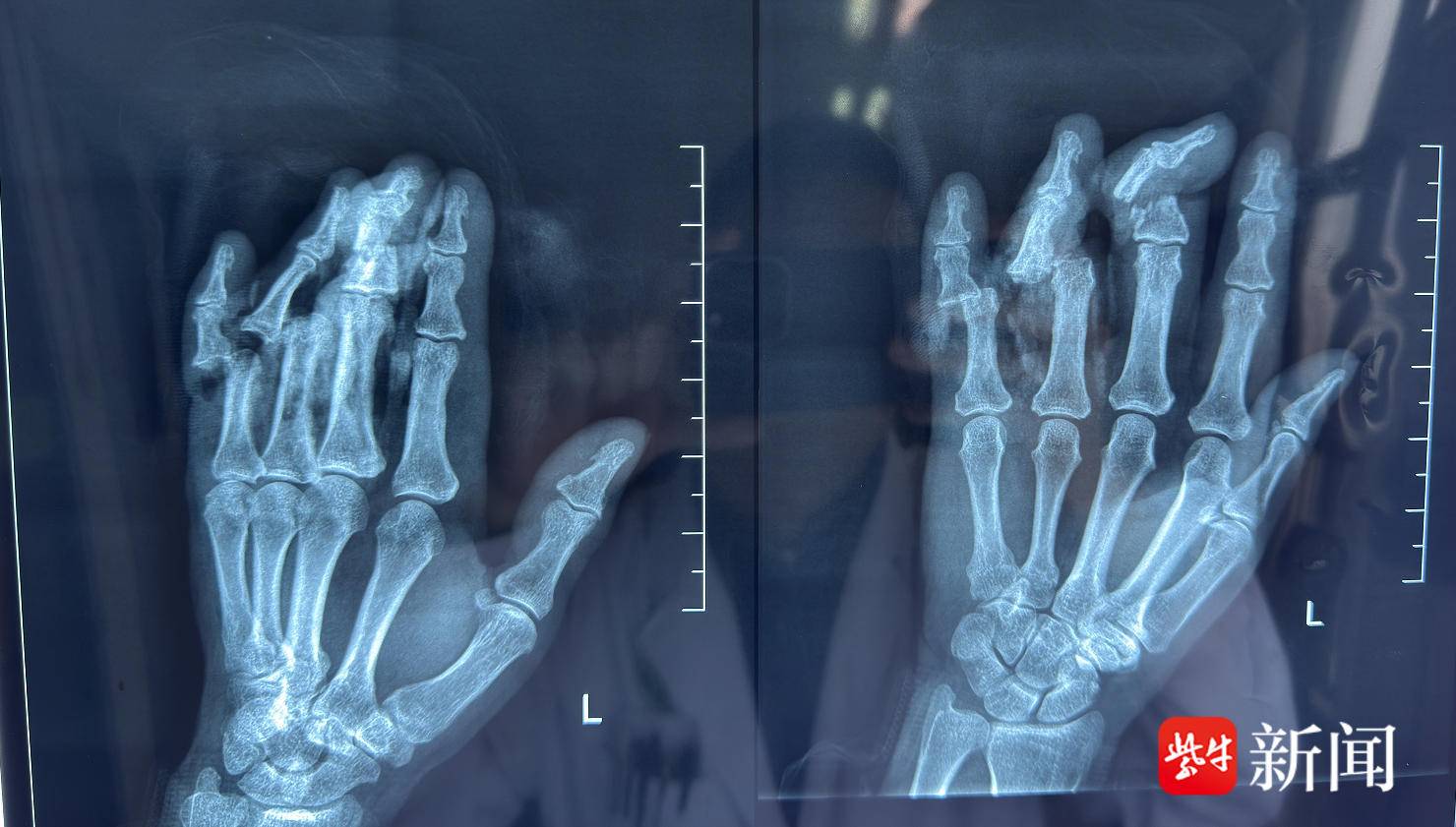 快一分钟就多一分手指接成功的概率。患者转运至中大医院后,医院立即启动救治绿色通道,急诊医护人员第一时间联系烧伤整形科会诊,迅速为患者完善影像学检查。“患者左手3、4、5指完全离断,局部挫伤严重,仅残余部分皮肤及软组织连接。”接诊患者的烧伤整形科王柯医师介绍。检查结果明确显示患者左手中指骨折,左手环指中节骨基底旁见小片状骨性密度影,左手第4、5指近节关节脱位。