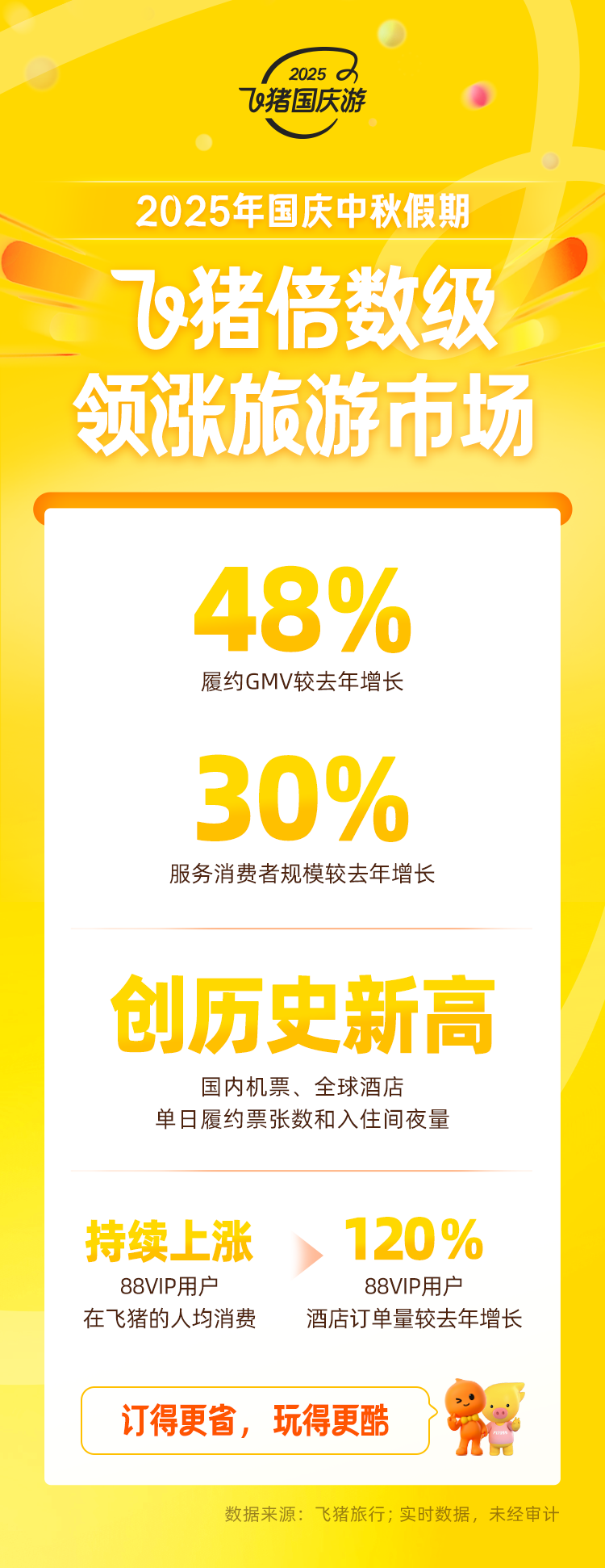 飞猪昨日公布2025年国庆中秋假期业绩:履约GMV较去年增长48%,服务人次较去年增长30%。