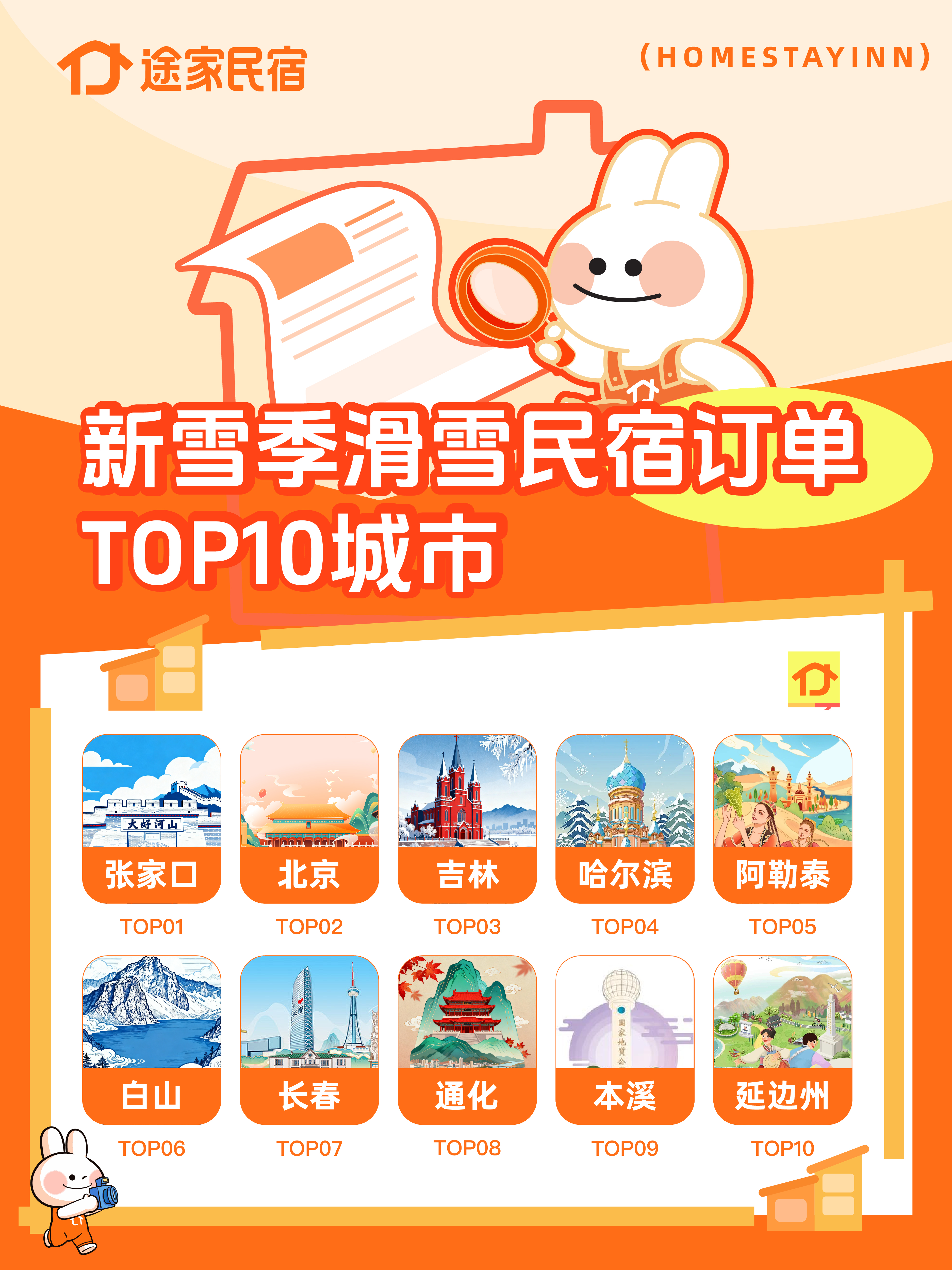 截至11月中旬,在途家平台,张家口的滑雪民宿预订量位居全国第一。由于雪季提前拉开帷幕,张家口滑雪民宿的预订量同比去年大涨约六成,当地的民宿订单主要集中在崇礼各大雪场周边。北京的滑雪民宿订单主要集中在密云、昌平等郊区的滑雪场周边,预订量排名第二。吉林、哈尔滨、阿勒泰、白山、长春、通化、本溪、延边州等北方冰雪城市,滑雪民宿的预订量位居全国前十。