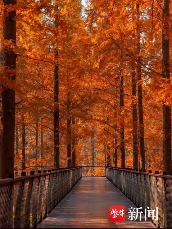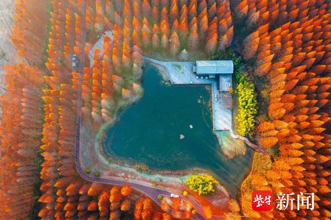 层林尽染、绚烂如醉,斑斓色彩、绵延不绝……在不经意间,黄海森林万亩水杉林进入红叶全盛期,华东地区规模最大的水杉景观带呈现“红透”盛景。