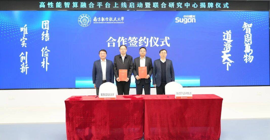 1月20日下午,南京航空航天大学(以下简称南航)联合曙光信息产业股份有限公司(以下简称“中科曙光”)、中国联合网络通信有限公司江苏省分公司(以下简称“江苏联通”)共同举办学校高性能智算融合平台上线启动暨联合研究中心揭牌仪式。中科曙光总裁历军、副总裁王海荣,江苏联通党委书记、总经理彭胜军,党委委员、副总经理张国鹏,南航校长姜斌,副校长张启钱出席活动。