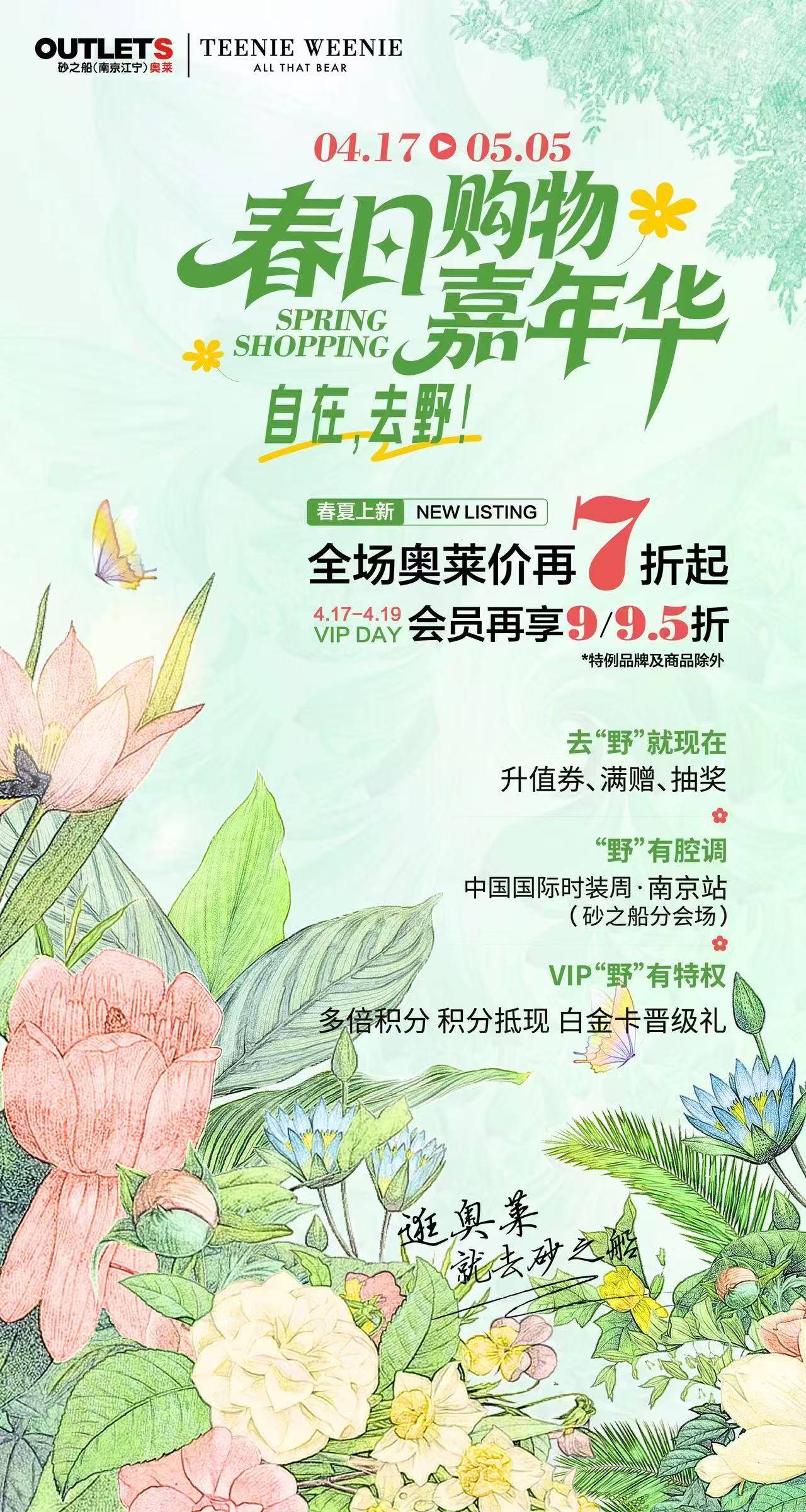 春风拂秣陵,旷野启新章。4月17日至19日,砂之船(南京江宁)奥莱“春日购物嘉年华”重磅启幕,以“自在去野”为内核,打破商业与生活边界,打造一场融合时尚、自然、人文的城市级风尚盛宴,为南京市民呈现全新春日生活方式体验。