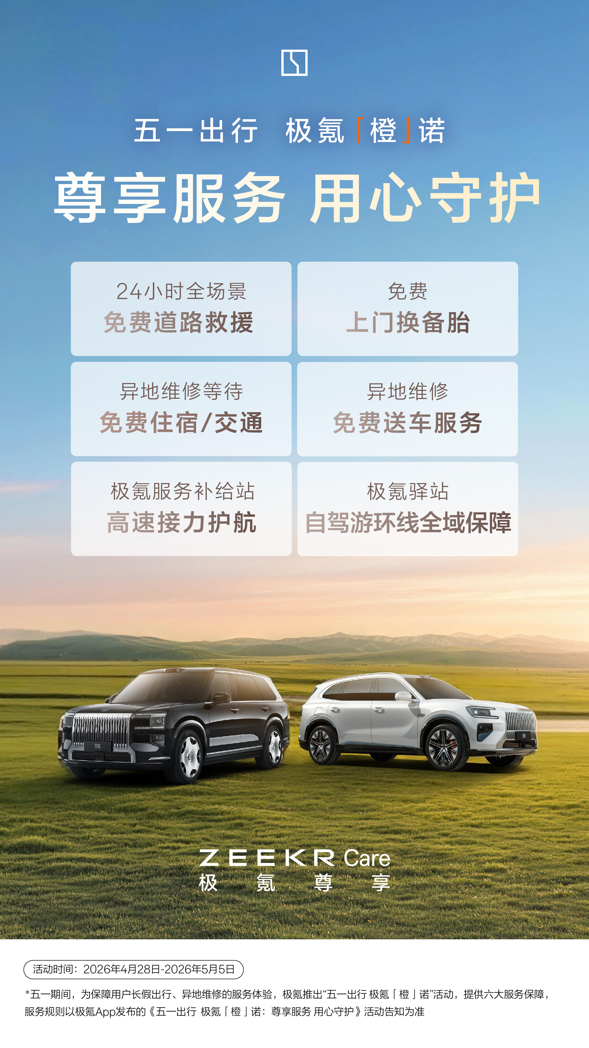 高车流量的节假日,已经成为了车企比拼服务能力的舞台。4月28日至5月5日,极氪正式推出“五一出行 极氪‘橙’诺”六大专属守护服务,以覆盖全场景的贴心保障,让每一位用户都有尽兴奔赴的底气。
