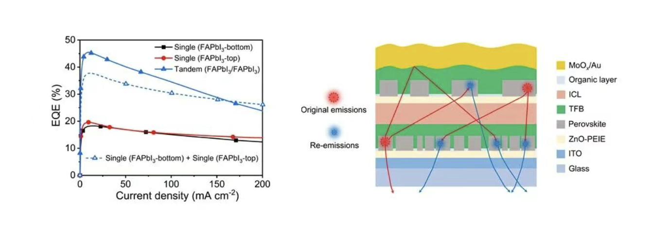 团队通过实验验证了这一机制:由发光峰742nm的底层和802nm的顶层钙钛矿组成的叠层器件中,底层发射的高能光子被顶层吸收后重新发射,使顶层发光效率高于单结器件;瞬态荧光光谱分析也证实,顶层材料能吸收底层的长寿命光子并产生额外辐射复合。三维时域有限差分法模拟显示,这种循环效应可有效减少波导损耗和寄生损耗,实现“1+1>2”的效率突破。