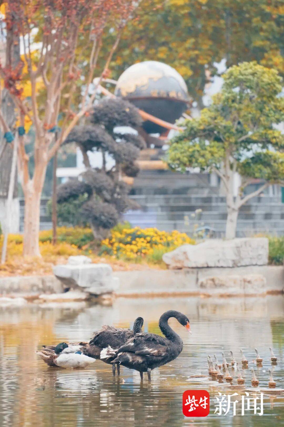 校园里来了两位新朋友——一对身姿优雅的黑天鹅,颈曲如绸 ,雍容翩跹。它们的到来为秋日的校园,增添了一抹灵动的色彩。