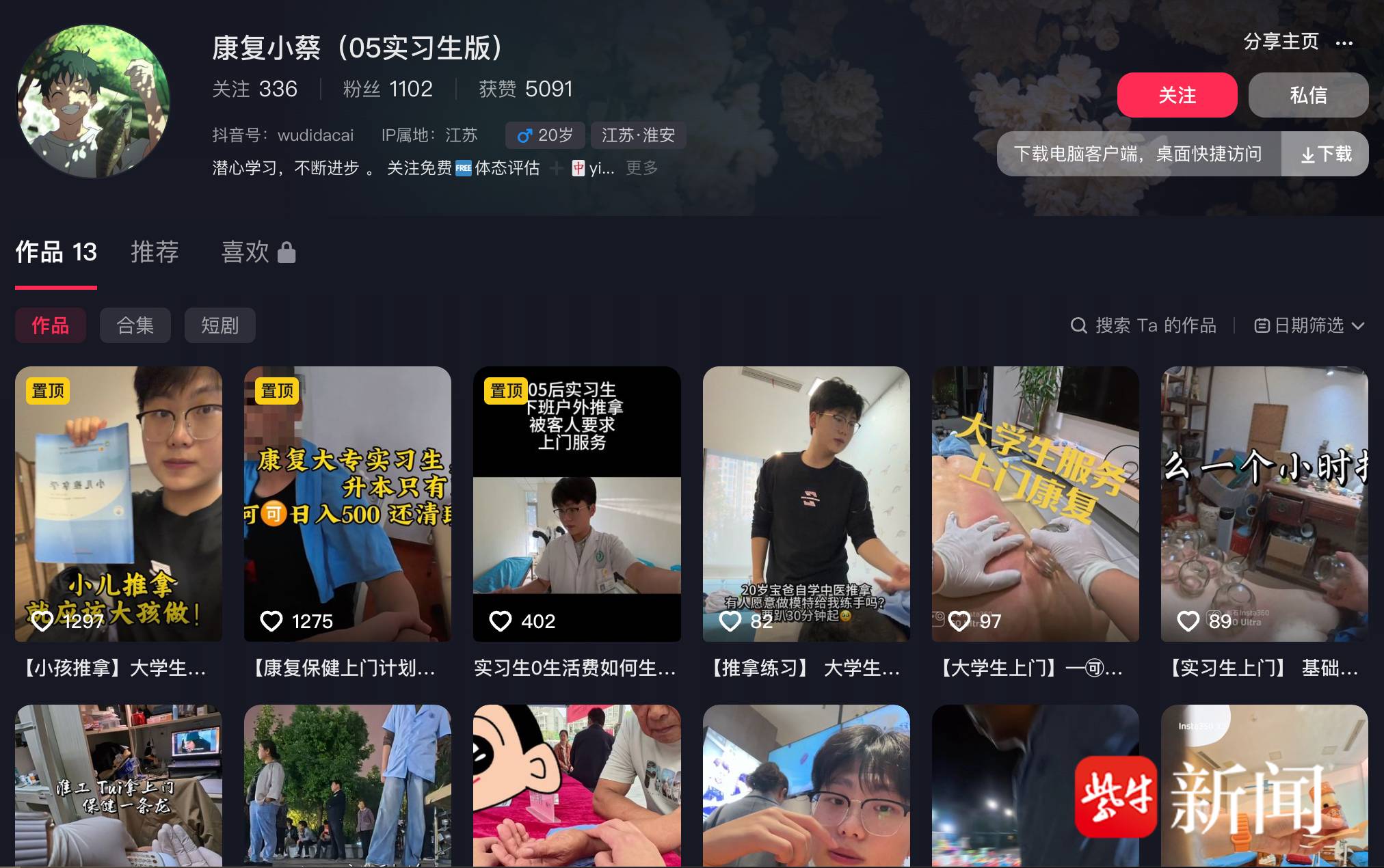 据了解,从今年6月起,蔡槿在淮安当地一家医院实习,每天跟师坐诊,为患者进行力所能及的推拿治疗,缓解颈肩腰腿痛等问题。同时,在老师的鼓励下,他也在抖音上开了“康复小蔡(05实习生版)”账号,分享义诊、户外推拿等实习日常。记者看到,该抖音账号目前已经有超过1000个粉丝,点赞数超5000。