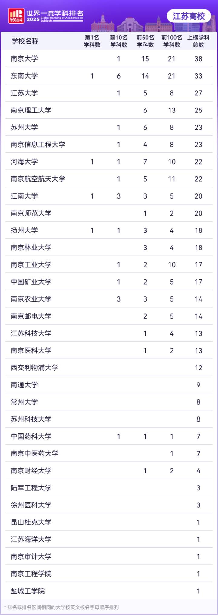在2025软科世界一流学科排名中,江苏高校表现领跑全国,32所高校的443个学科榜上有名,上榜学科数荣登全国第一名。