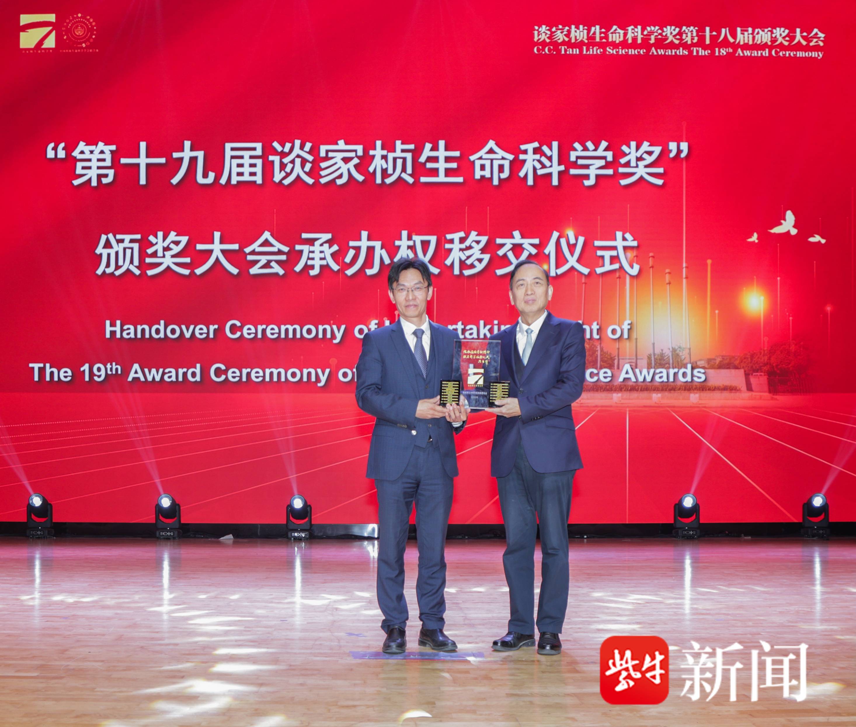 会议期间还举行了谈家桢生命科学奖颁奖大会承办权移交仪式。大会承办权由中国药科大学交给下一届承办单位复旦大学。复旦大学党委副书记袁正宏代表复旦大学校长金力与中国药科大学校长郝海平完成交接。