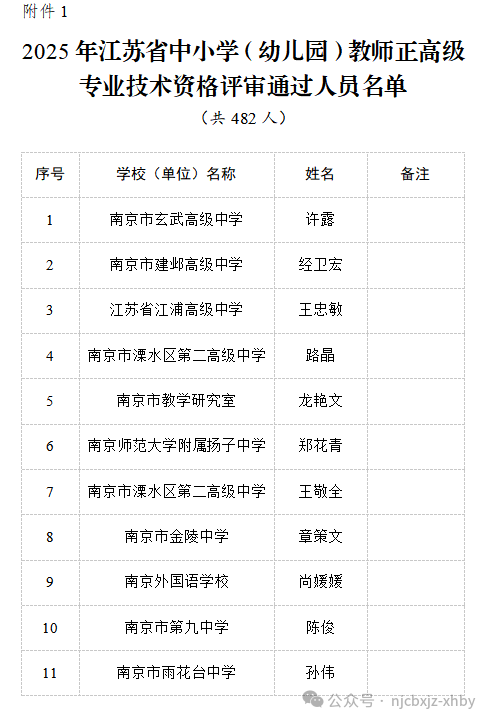 2025年江苏省中小学(幼儿园)教师正高级专业技术资格评审通过人员名单具体如下: