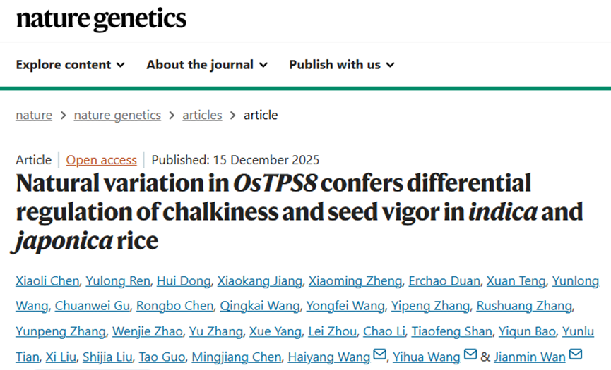 万建民院士团队在《Nature Genetics》发表研究成果